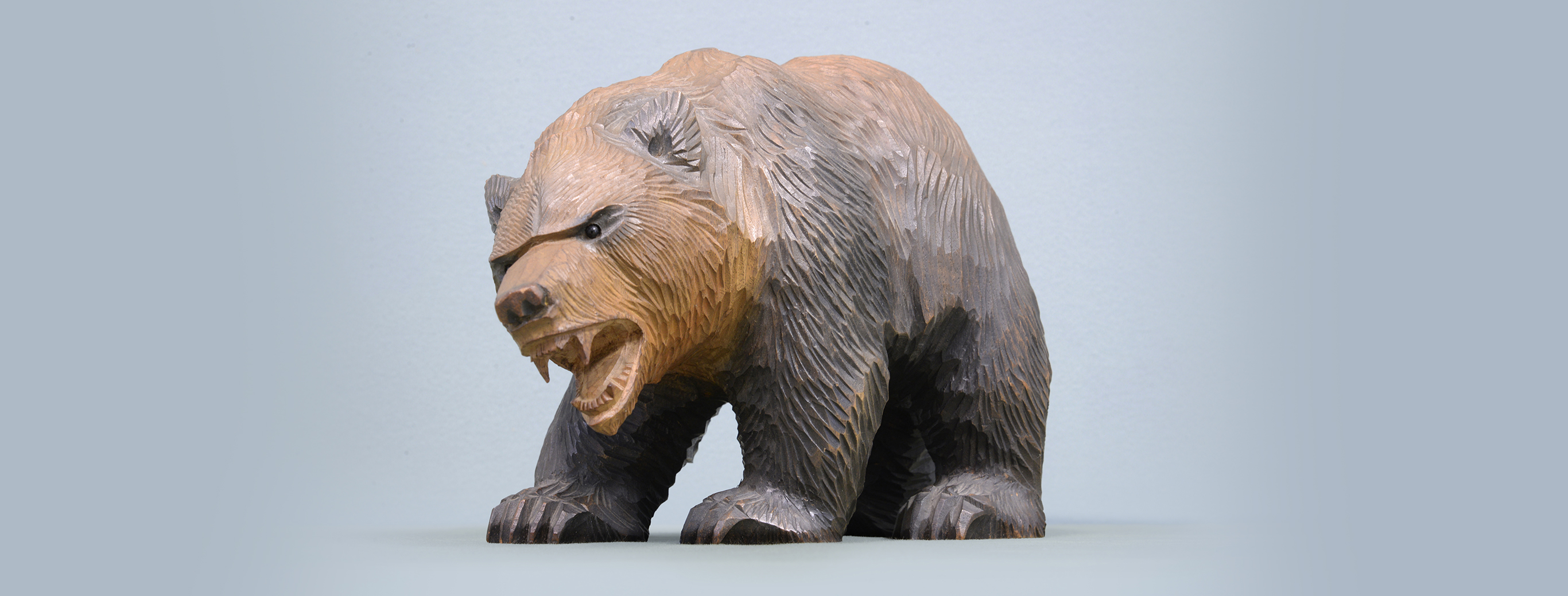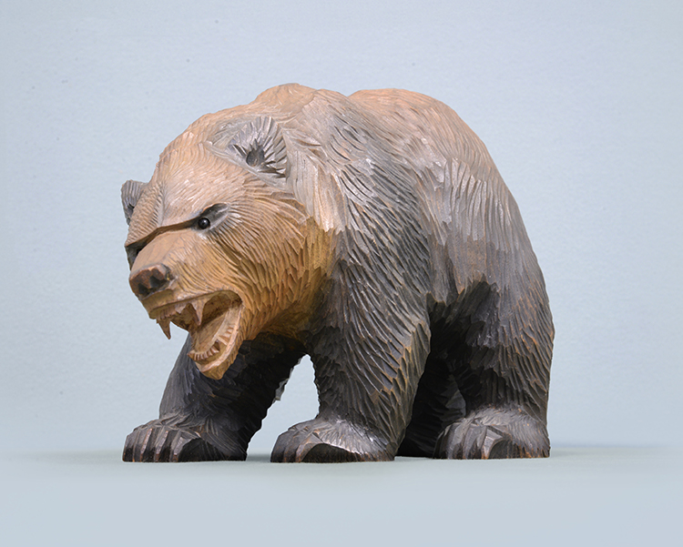 実は、木彫り熊の発祥地・八雲で作られた熊には、鮭をくわえているものがほとんどないのだそうです。理由は、八雲の作家たちが参考にしていたのが、徳川農場で飼育されていた2頭の熊だったから。自然の中で鮭を捕る“野生の熊”ではなく、身近な存在として接していた“飼われている熊”がモデルだったため、どこか親しみのあるポーズや、やさしい表情が多く生まれたといいます。