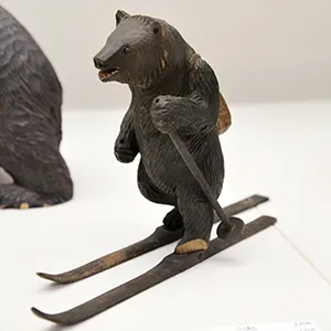 戦前に人気だったスキーをしている木彫り熊。いきいきとした表情で、どこか嬉しそうな姿がなんとも愛くるしいです!