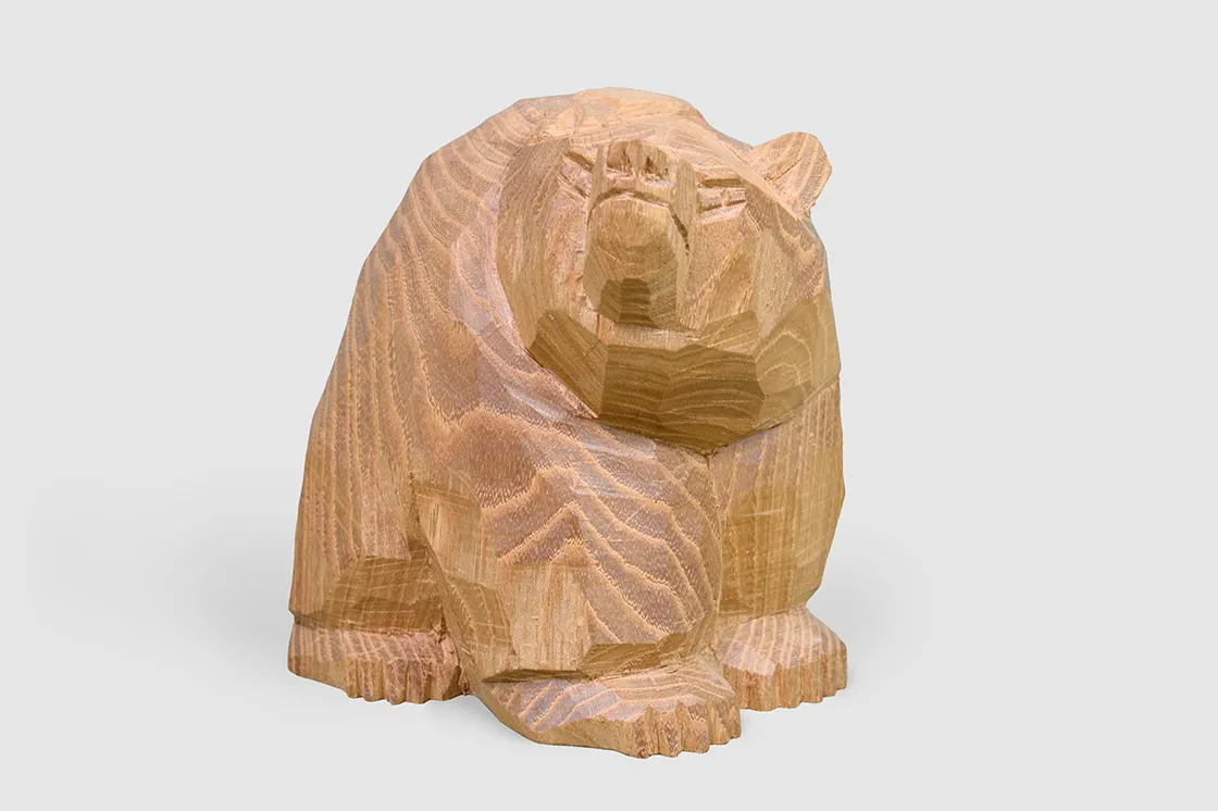 一方で、私たちが今回心惹かれたのは、「抽象熊」と呼ばれる面彫りの木彫り熊たち。デフォルメされた独特のフォルムは、一見するとシンプルな木の塊のようですが、削り跡を生かした素朴な佇まいの中に、素材と向き合う力強さや、どこか愛嬌ある表情が息づいています。
