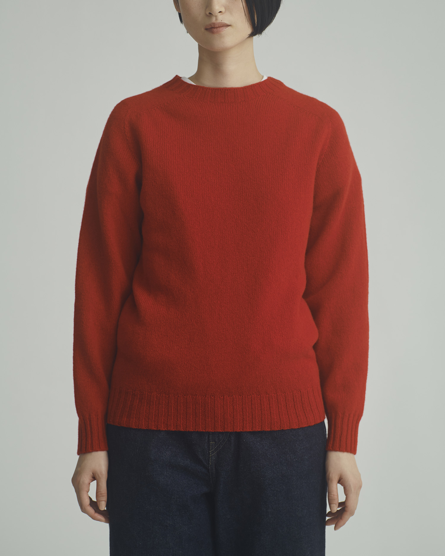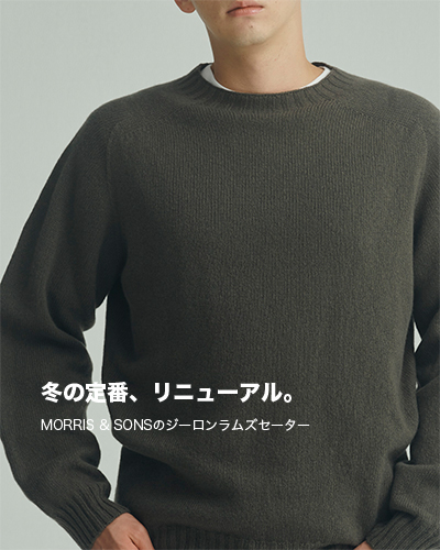 秋冬シーズンで欠かせない定番アイテムの一つ、MORRIS & SONSのラムズウールセーター。毎年作り続けてきた定番アイテムですが、今シーズンはゆるめのシルエットで着たい気分なので、少し大きめのサイジングにリニューアルしました。糸はいつものジーロンラムズウール。ラムズウールの中でも最高級と言われるウールが、身体を柔らかく温かく包み込みます。