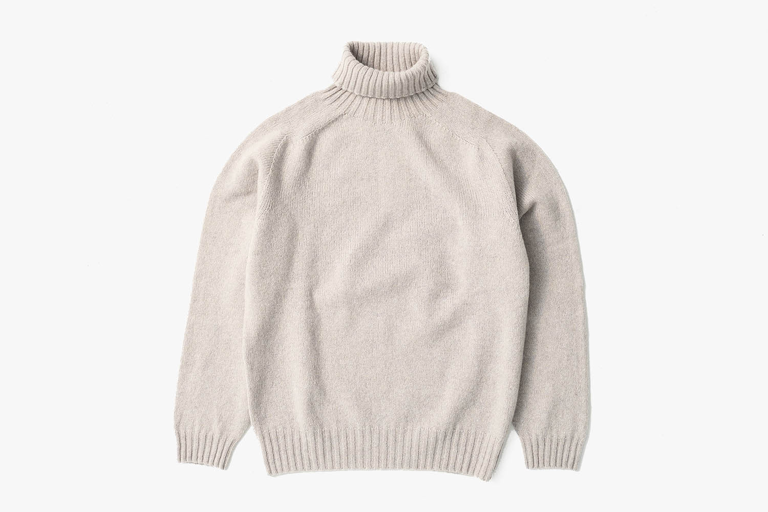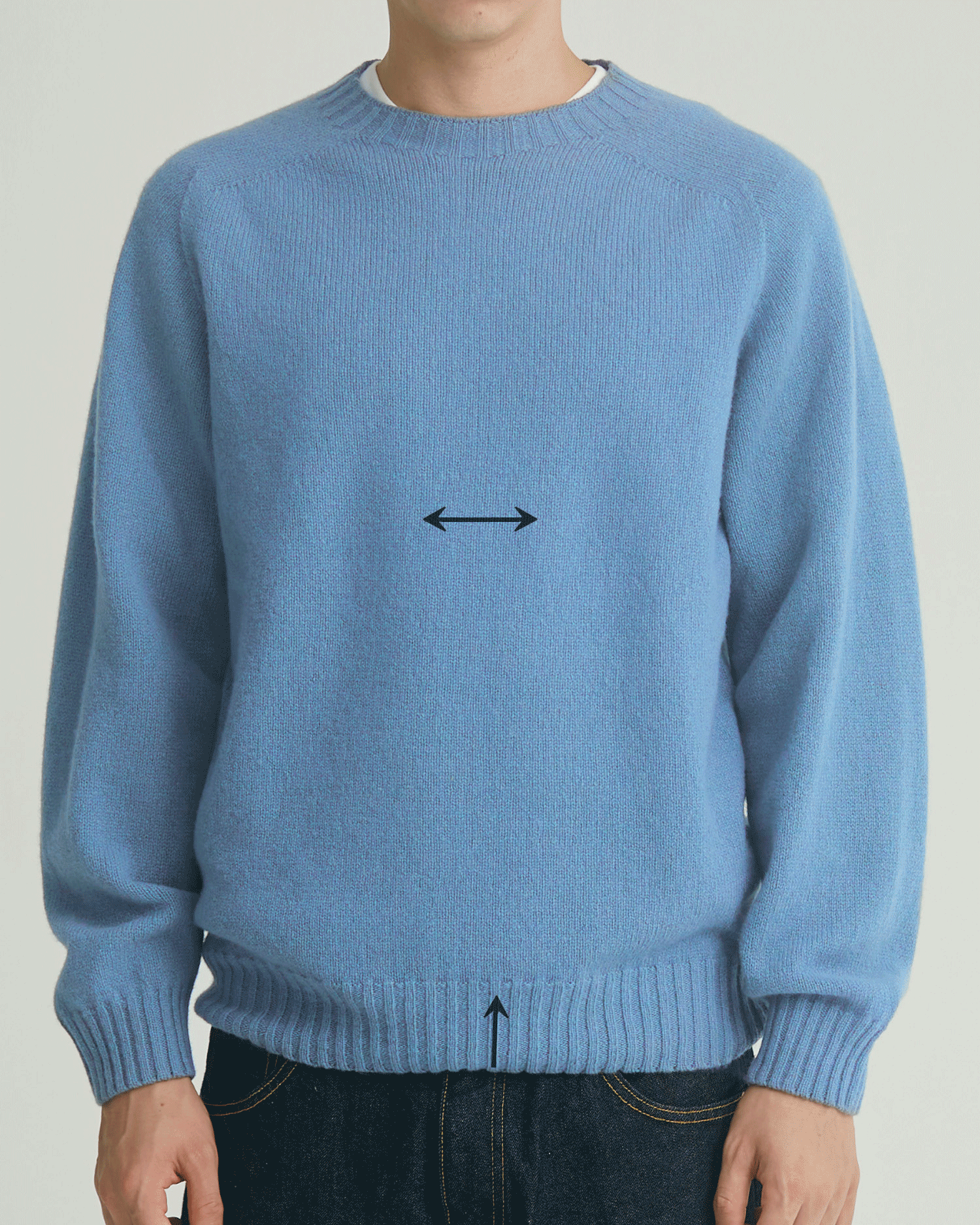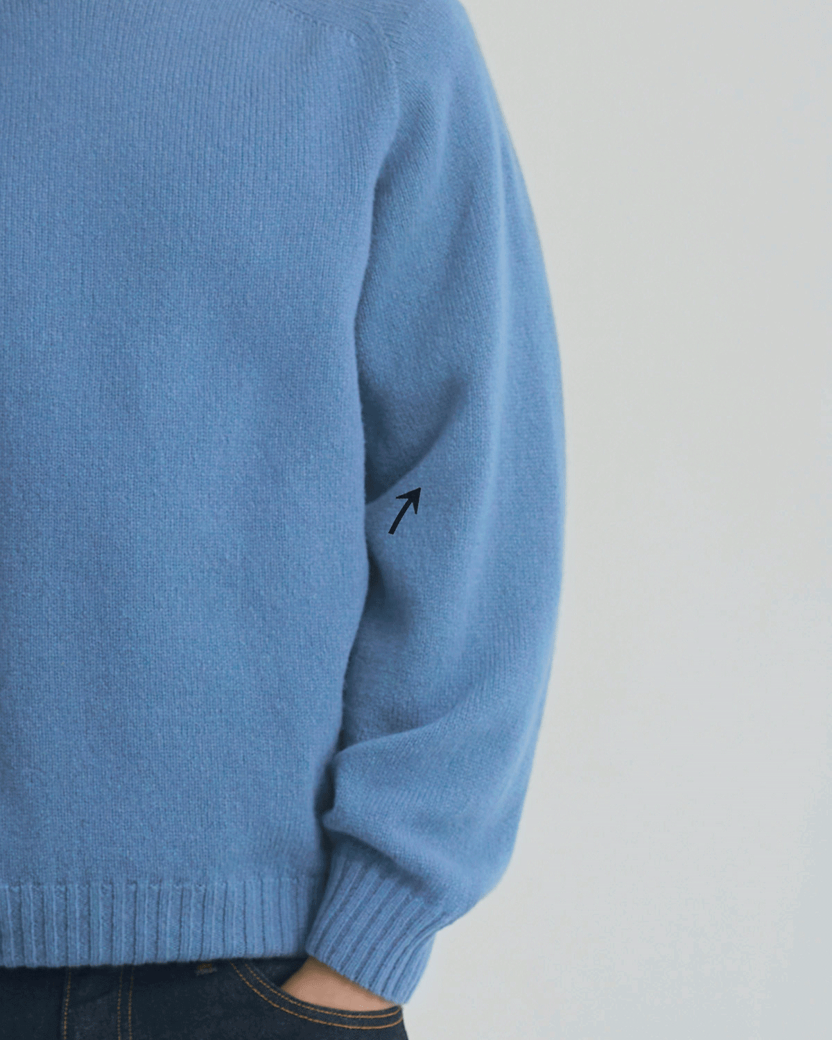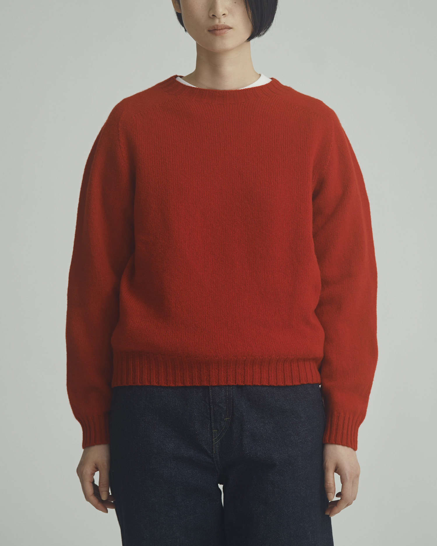 デザインはベーシックなクルーネックセーターながら、ボディとアームに繋ぎ目がないシームレスなニッティング製法で編み立てています。そして、袖は運動性が高いラグランスリーブのサドルショルダーを採用。そんなディテールはそのままに、今シーズンからリニューアルしたポイントをご紹介します。