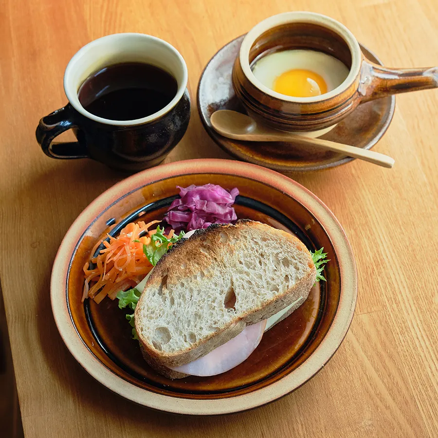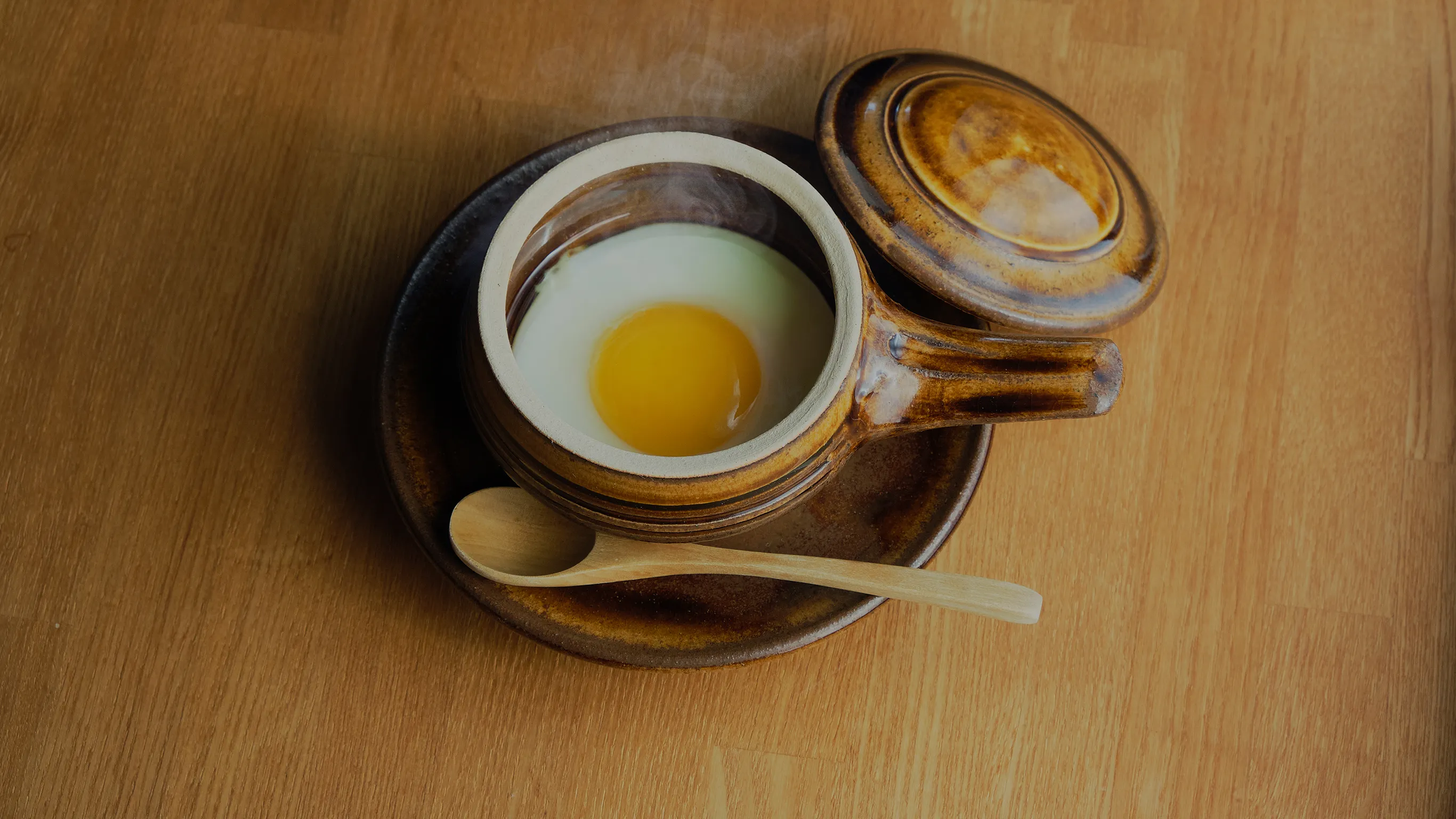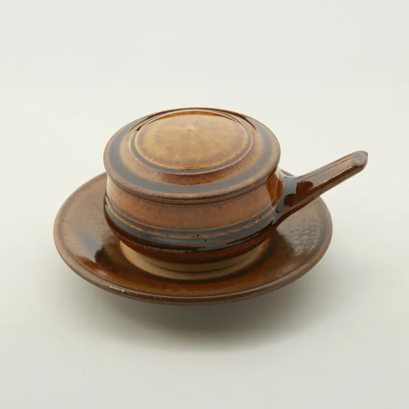 昭和28年、バーナード・リーチの実地指導を受けて生まれた耐火土製の器。直火にかけて卵を蒸し焼きにでき、そのまま受皿にのせて食卓へ。小さな道具ながら使い勝手がよく、朝の食卓に温もりを添えます。