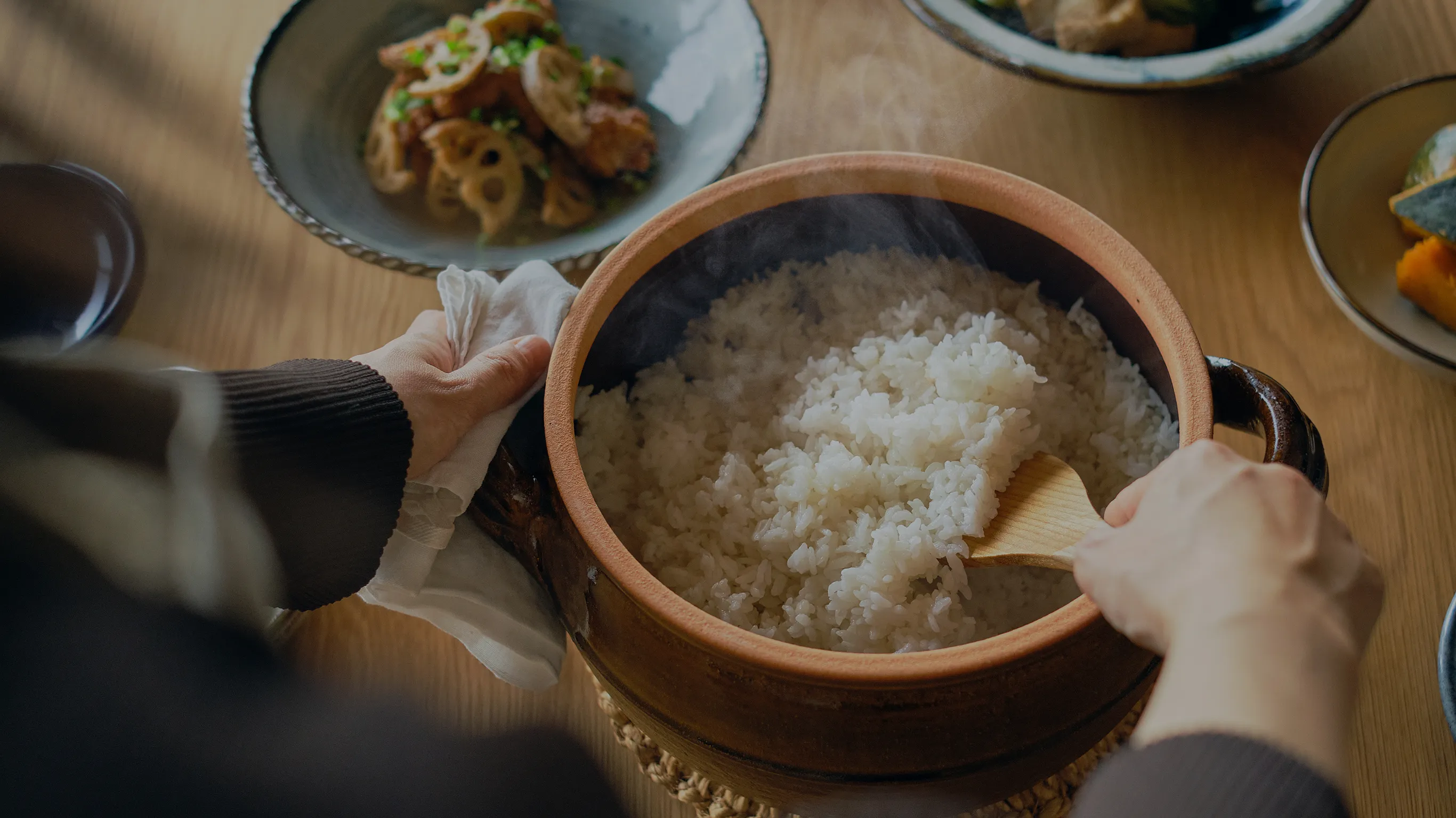 湯気の向こうに家族の声。炊き立てごはんの匂いと笑い声がまざって、一日の疲れがほどけていく。