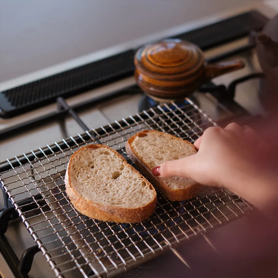 パンを好みの加減に仕上げる。いい匂いが漂いだし、徐々に焼き目がつくこの過程がすでに美味しい。