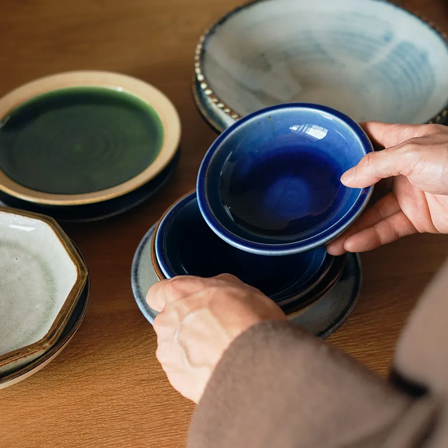 なかでも、深みのある藍色が印象的な「呉須」の器や、登り窯で焼かれた焼き締めの器に見られる焦げや窯変には、ひとつとして同じもののない美しさが宿っています。