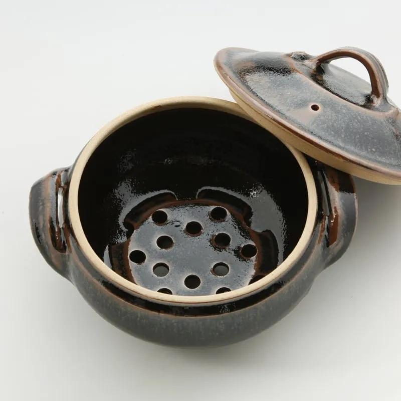出雲の食文化と朝鮮陶器に学び、金津滋氏の助言とバーナード・リーチ直伝の把手技法を取り入れて完成。蒸気を通す底穴や蓋の密閉性にも工夫を重ね、饅頭をふっくらと美味しく蒸し上げる実力派の一器です。