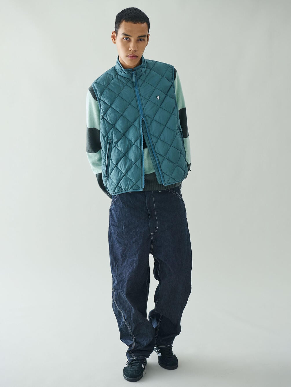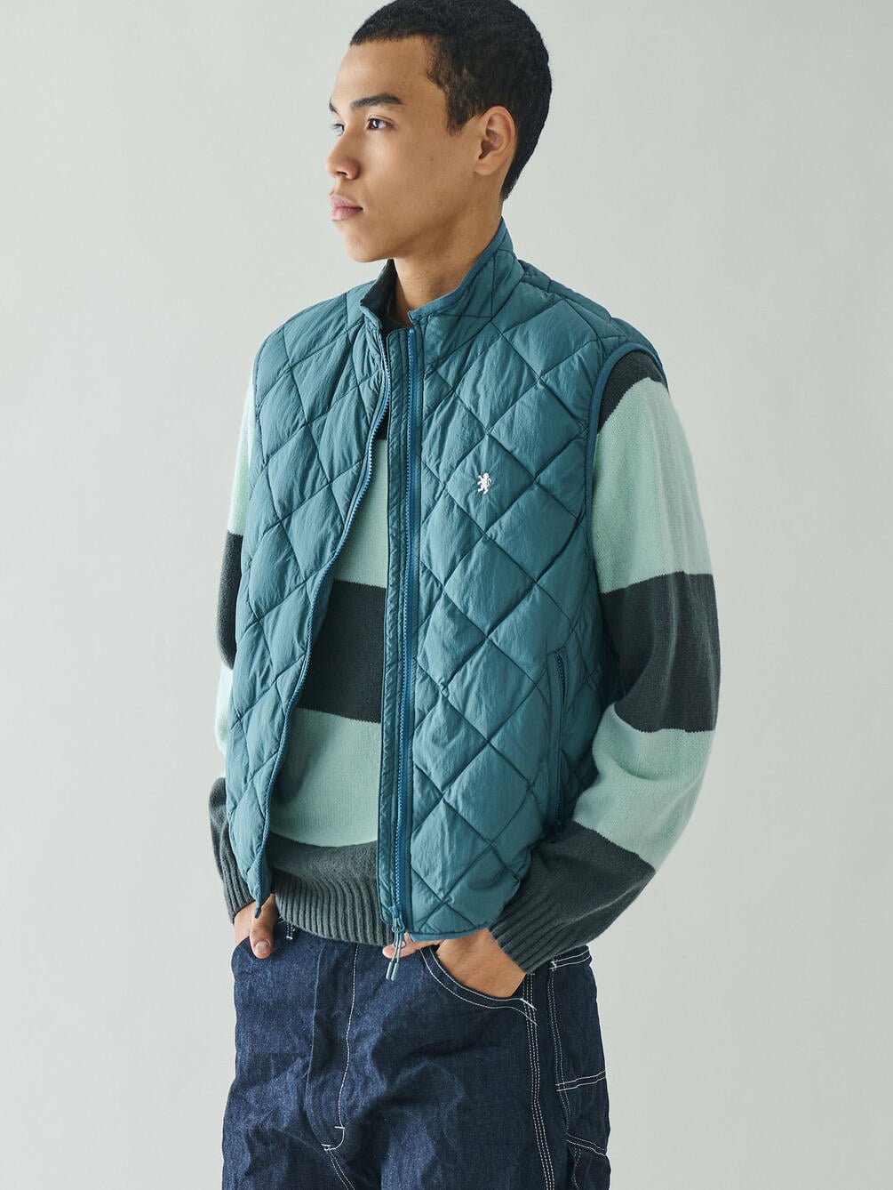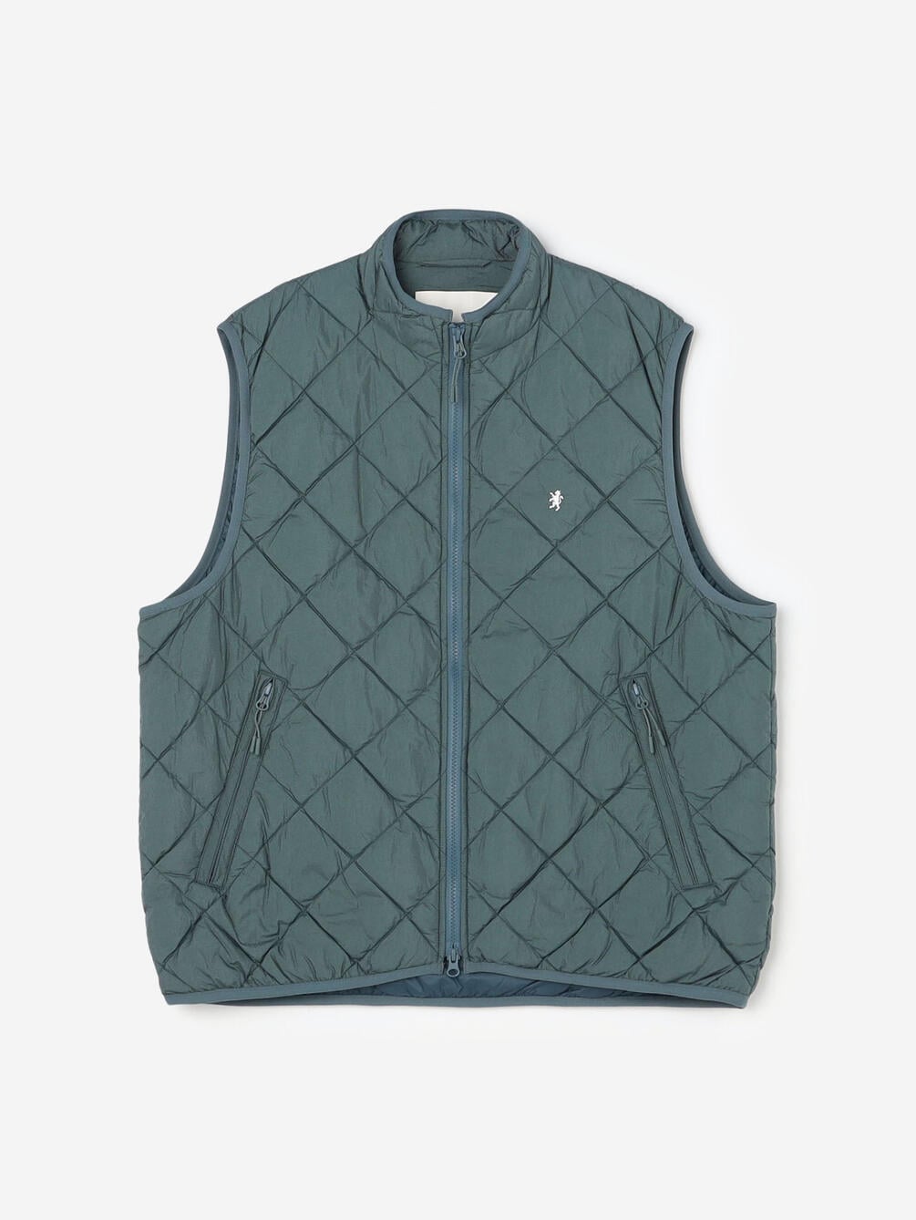 - スタンドカラーのキルトダウンベスト