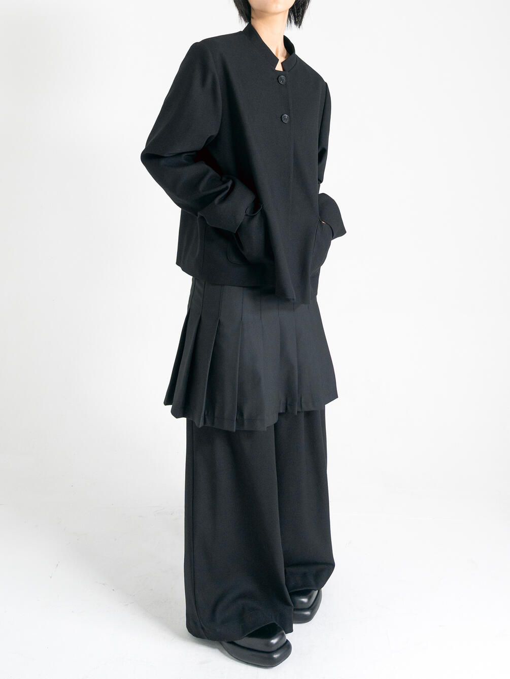 | 素材 | 表地:ポリエステル54% レーヨン24% ウール20% ポリウレタン2% 裏地:ポリエステル100% |