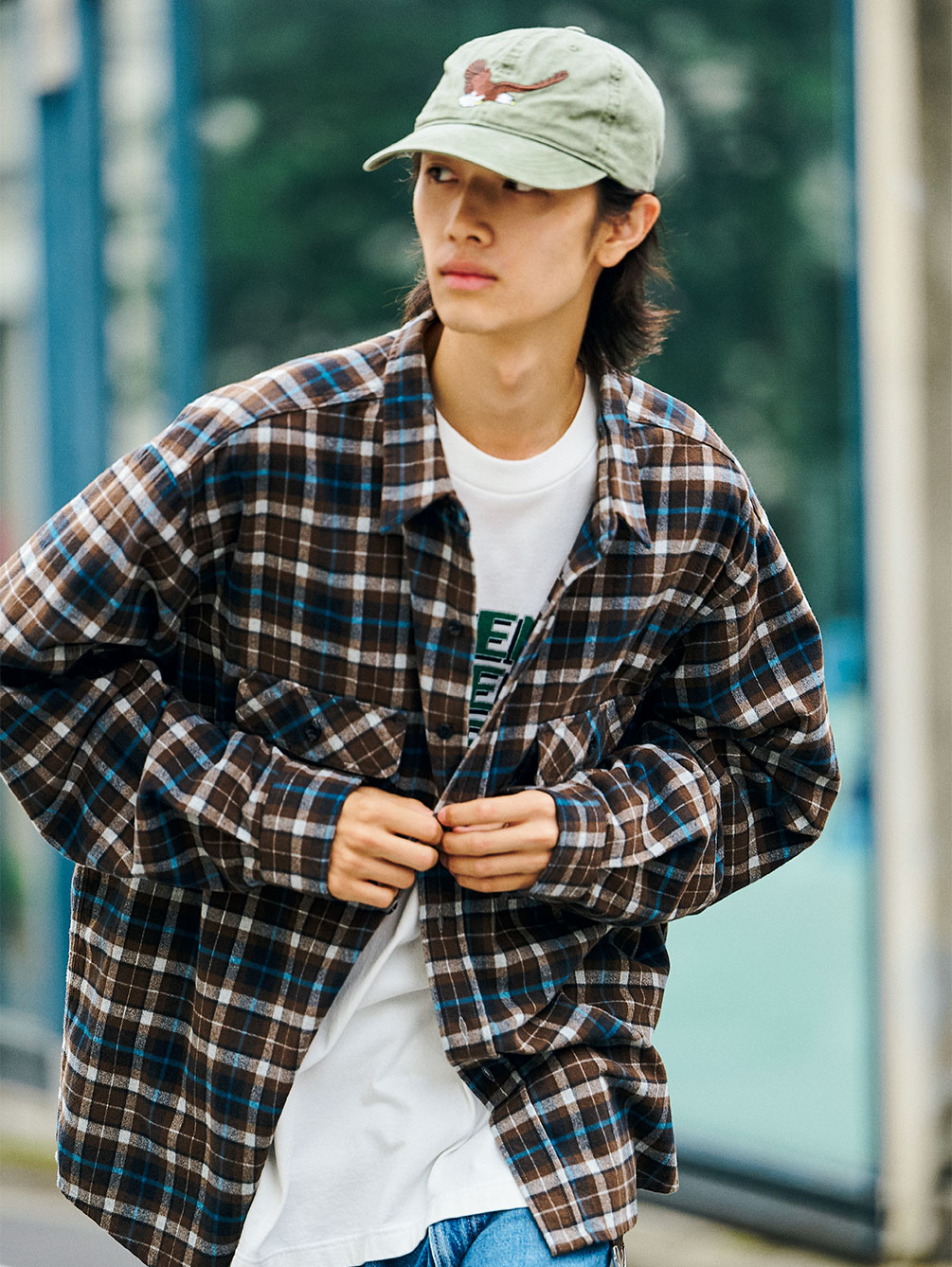 - レギュラーカラーのチェック柄シャツ