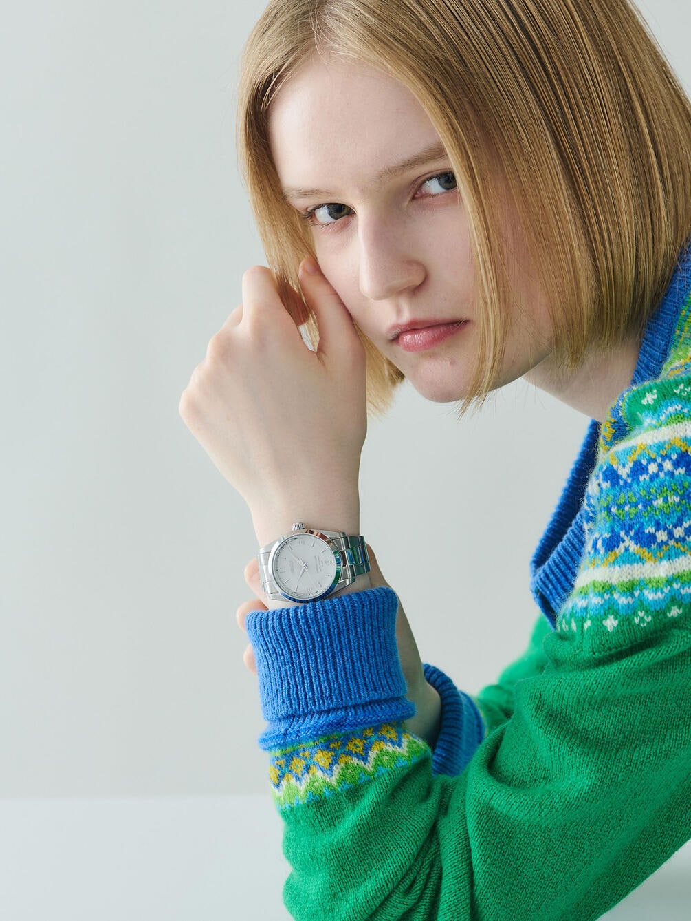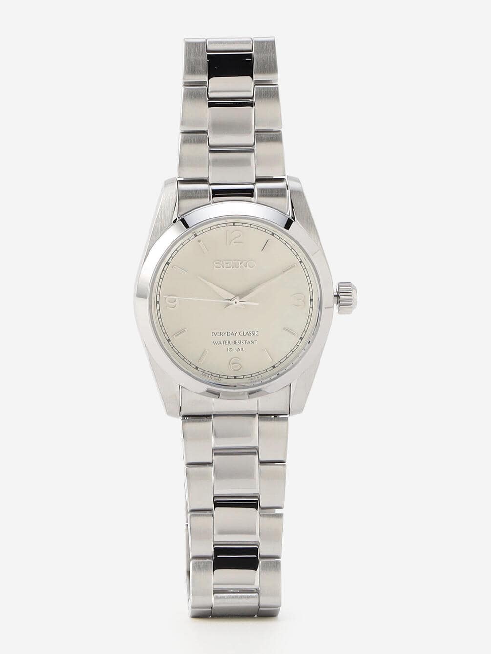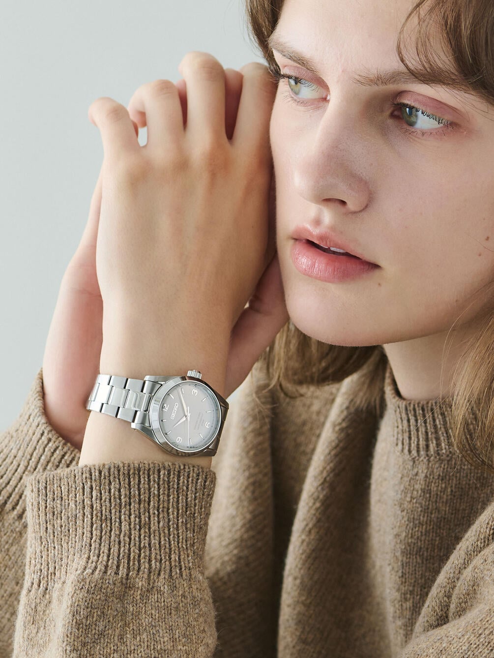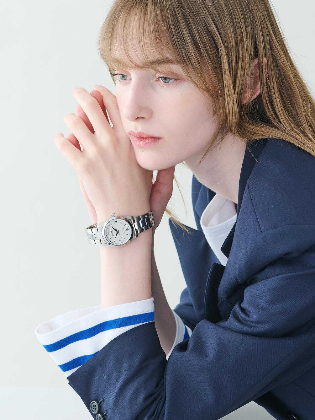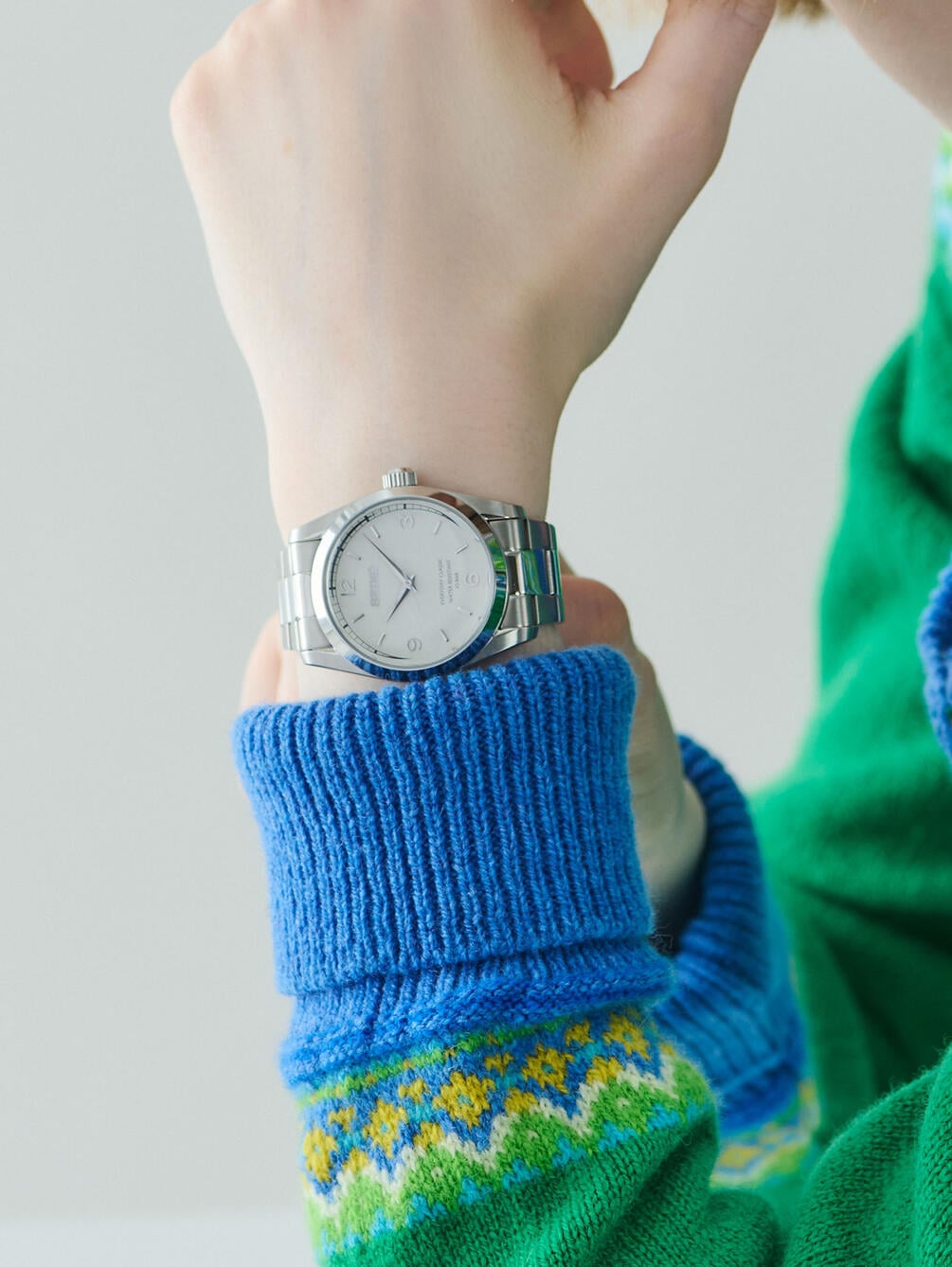 35㎜ケースは、小ぶりで主張しすぎず、性別や年齢を問わずに使える絶妙なバランス。文字盤には、長年使い込んだような風合いを感じさせるオフホワイトカラーを採用し、光の角度でさりげない立体感を生む埋め込み式のインデックスと、「EVERYDAY CLASSIC」の刻印、シンプルな3針スタイルがクラシックな表情を生み出します。毎日使えるようにムーブメントには扱いやすいクォーツ式を採用。カジュアルからトラッドまで、どんなスタイルにも合わせやすいこだわりの一本です。