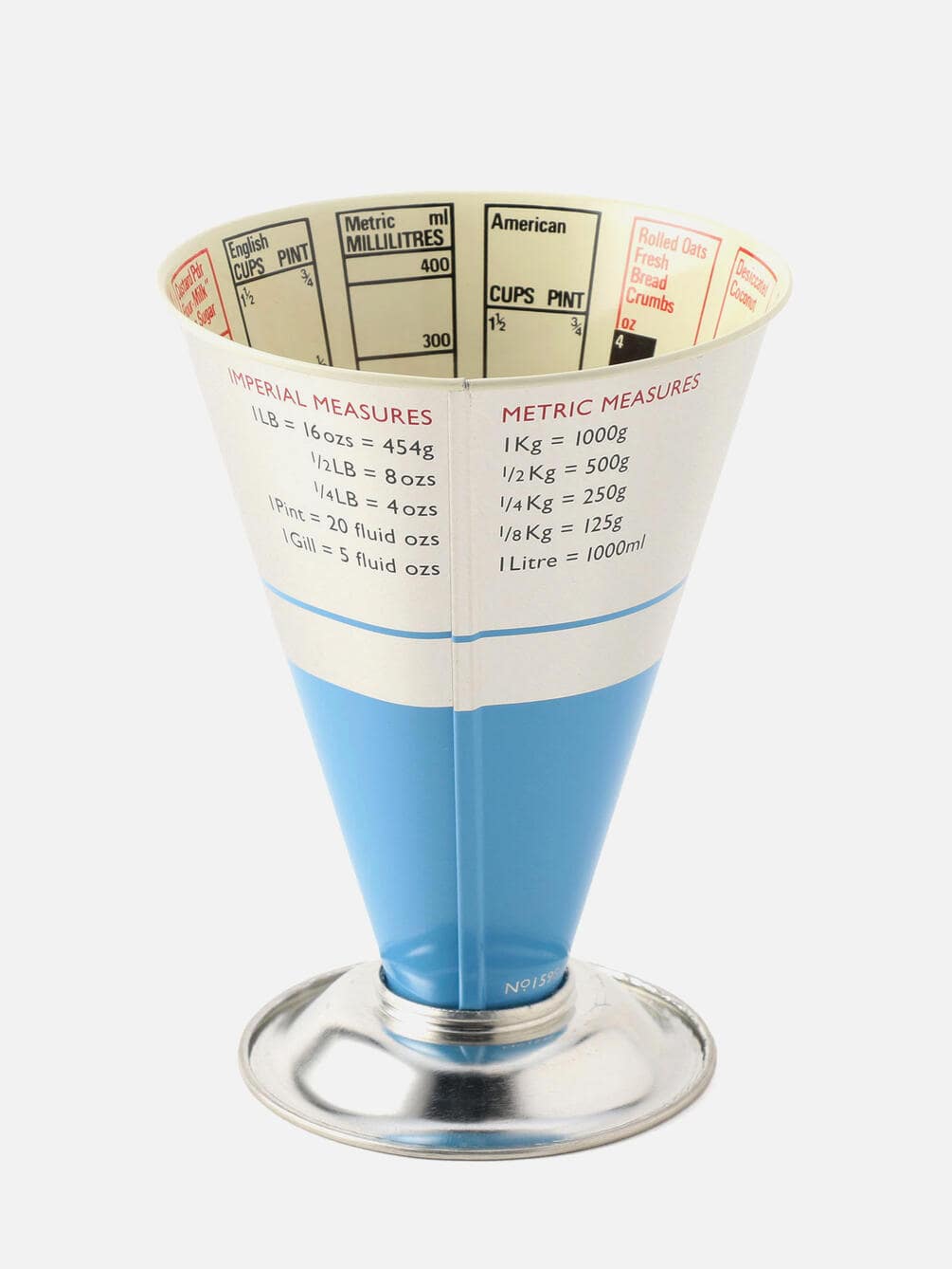 クラシックな乾物専用の計量カップ。小麦粉、砂糖、パン粉から大麦など、材料別に計量線が引いてあり、体積だけでなく重さもわかるようになっている優れもの。デザイン性が高く、キッチンに置いても様になります。