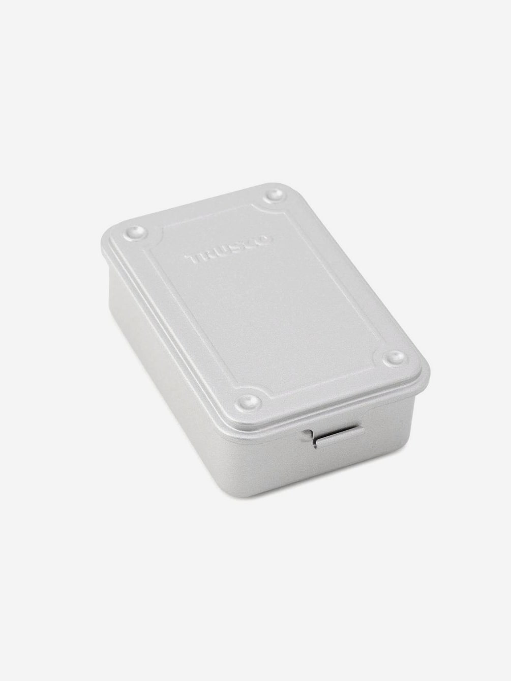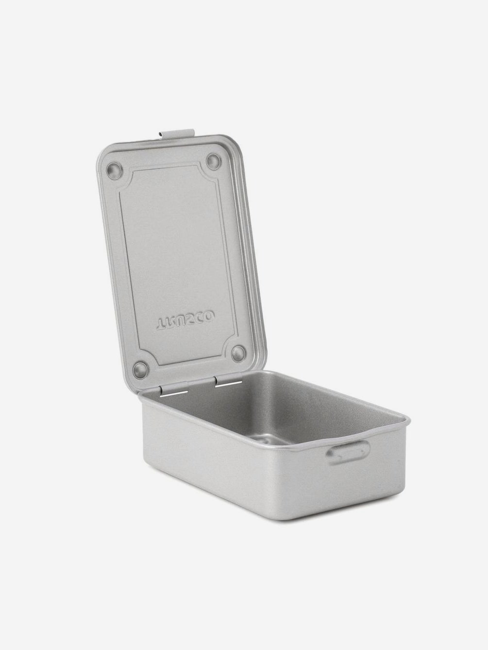 1959年創業の日本を代表する工業用機械メーカーによって作られている収納ボックス。ハードな使用に耐える頑丈なプレス一体型のスチール製。四隅に横滑り防止用凹凸が付いており、スタッキング可能です。文房具からネジ、お裁縫箱としても、あらゆるものの収納に活躍します。