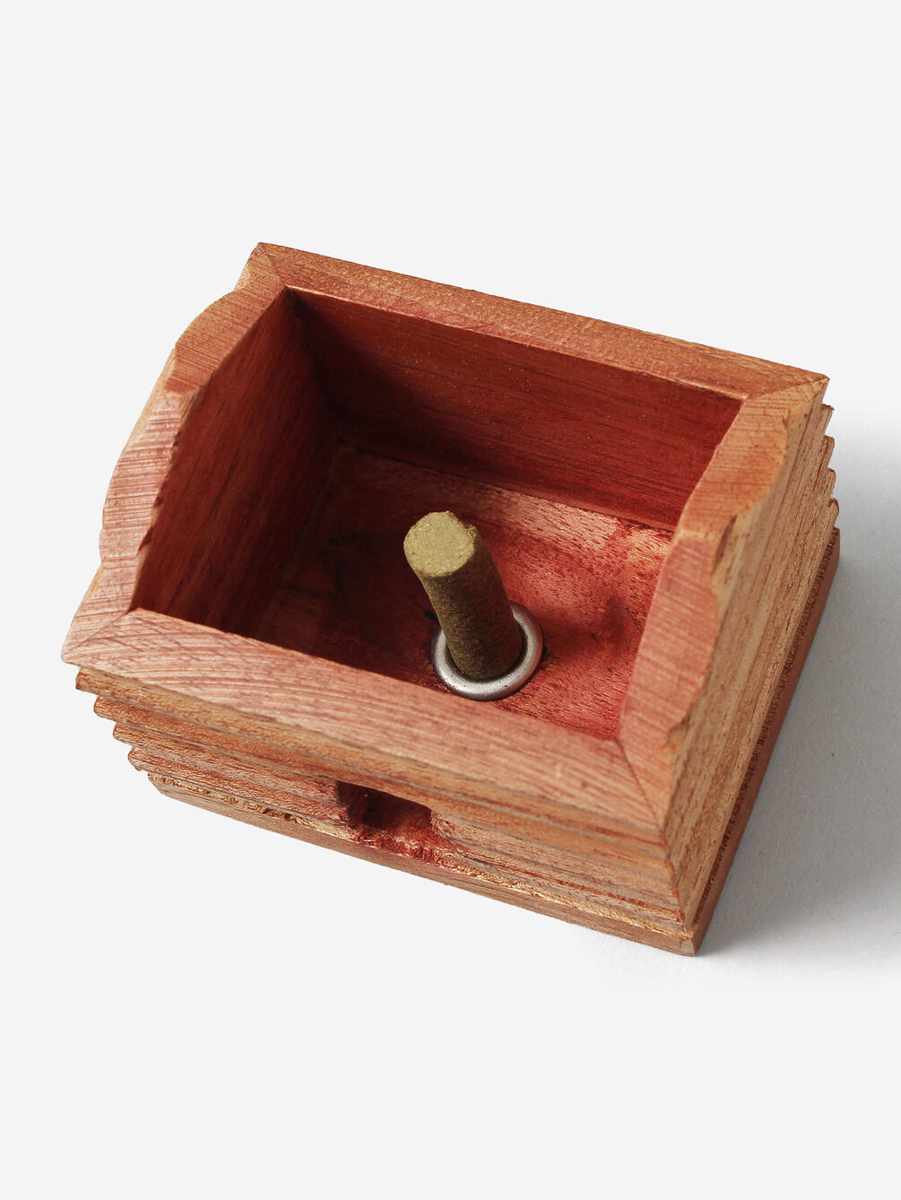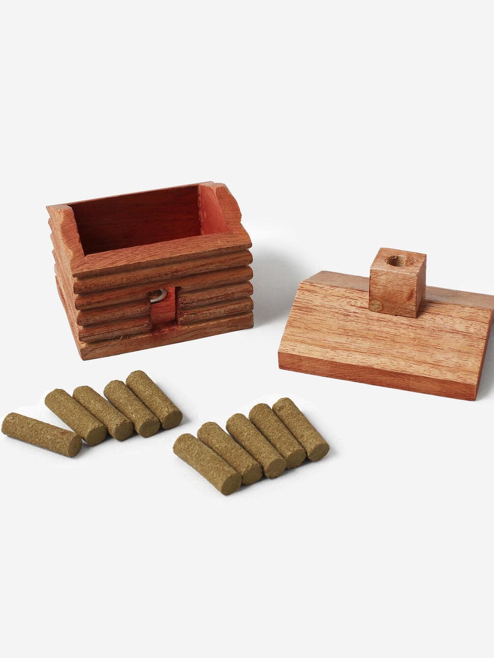 丸太小屋型のインセンスホルダー。お香の煙が煙突から出てくるユニークなデザイン。もみの木のお香が10本セットになっており、小屋の中にはお香立ても付属しています。