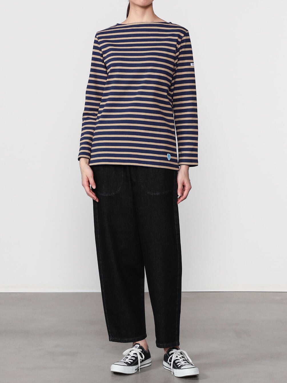 - ヒップポケットにブランドワッペンのアクセント