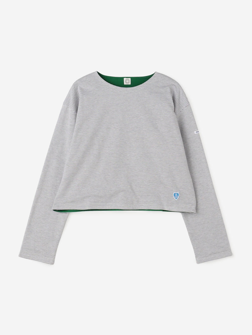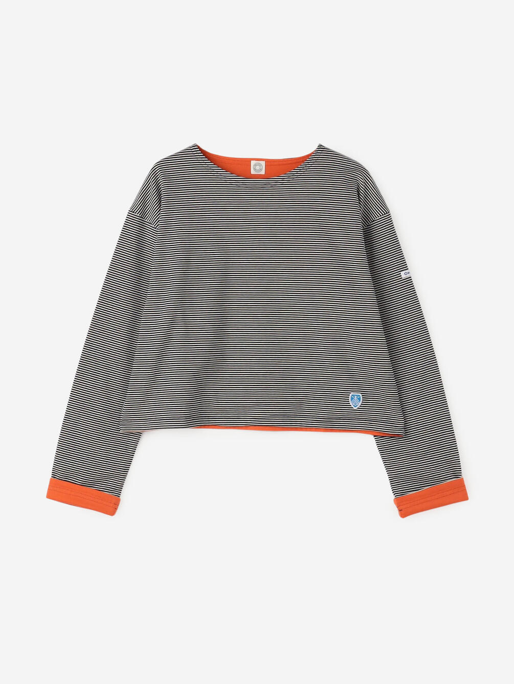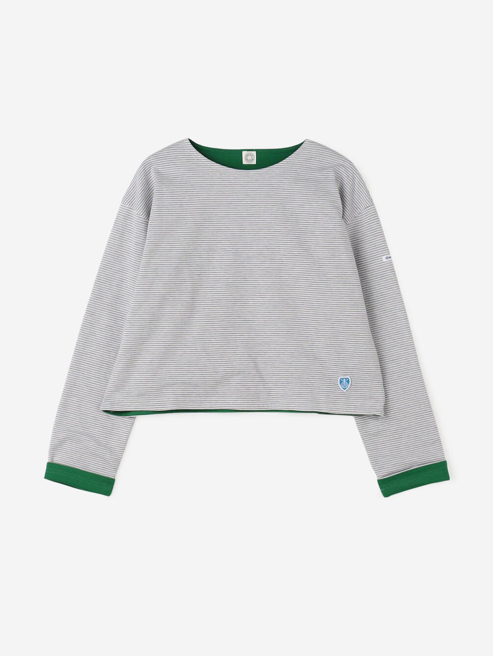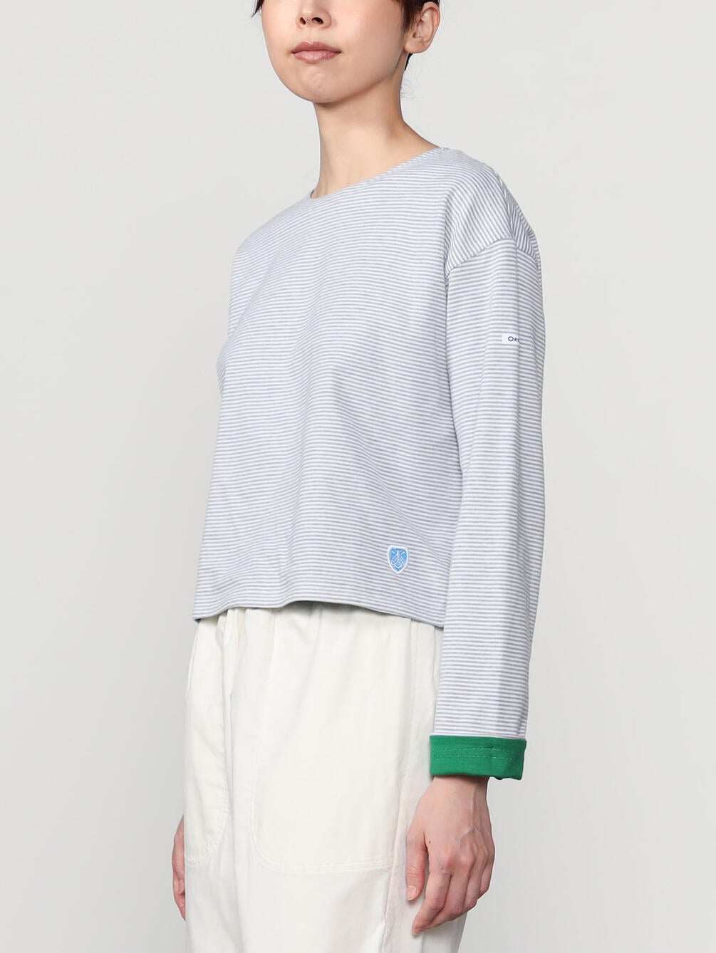 - 表地に糸染めボーダー、裏地に色味のきれいな単色天竺を合わせた2枚仕立てのカットソー