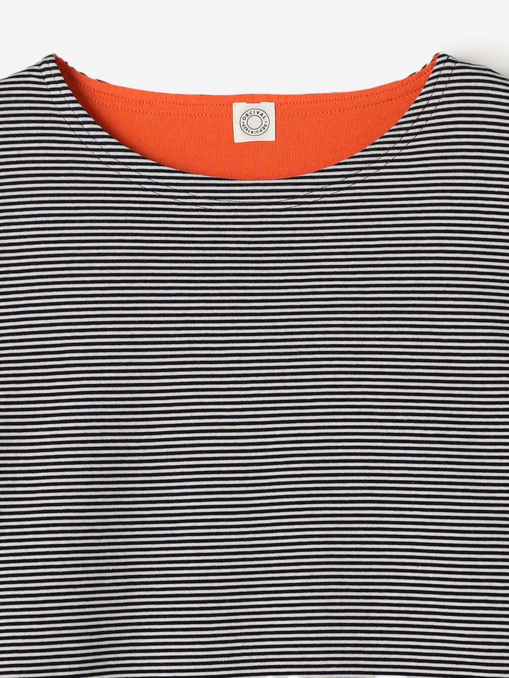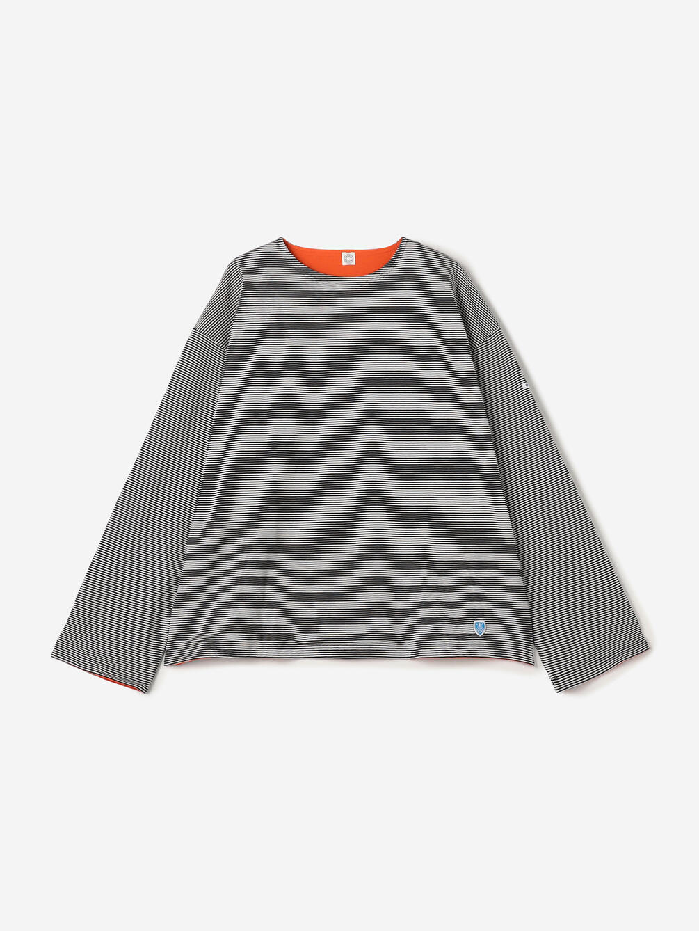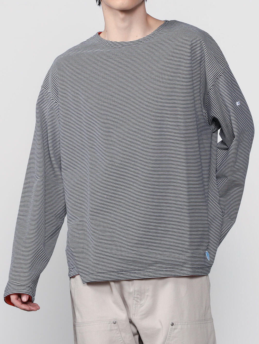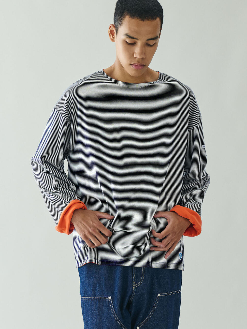 - 表地に糸染めボーダー、裏地に色味のきれいな単色天竺を合わせた2枚仕立てのカットソー
