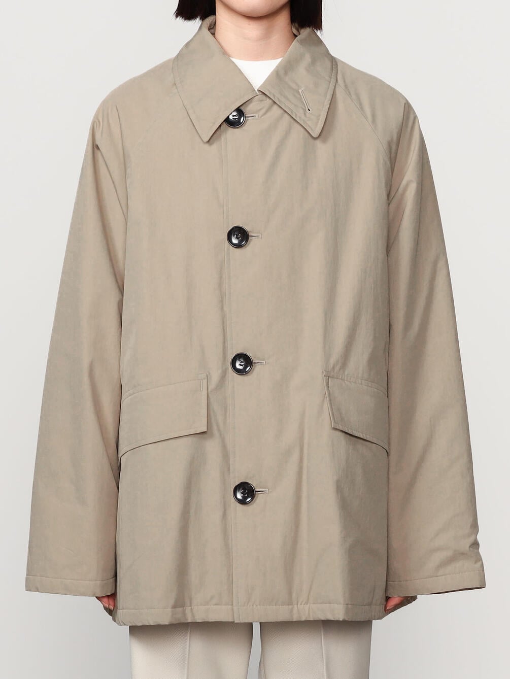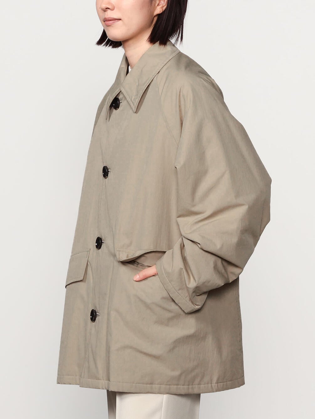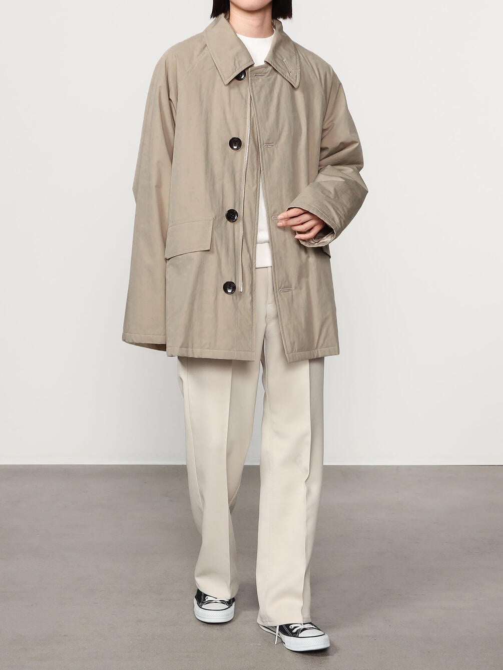 - ステンカラーの中綿ミドルコート