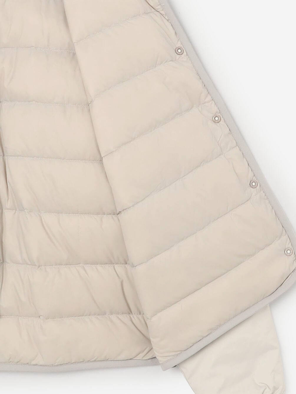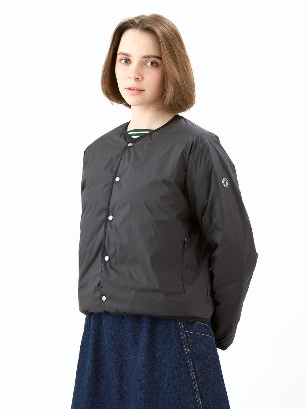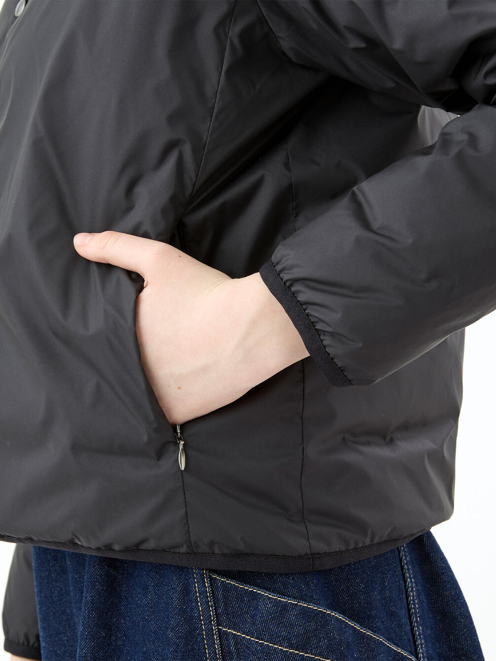 | 素材 | 表地:ポリエステル100% 裏地:ナイロン100% 詰物:ダウン90% フェザー10% パイピング部分:ポリエステル90% ポリウレタン10% |