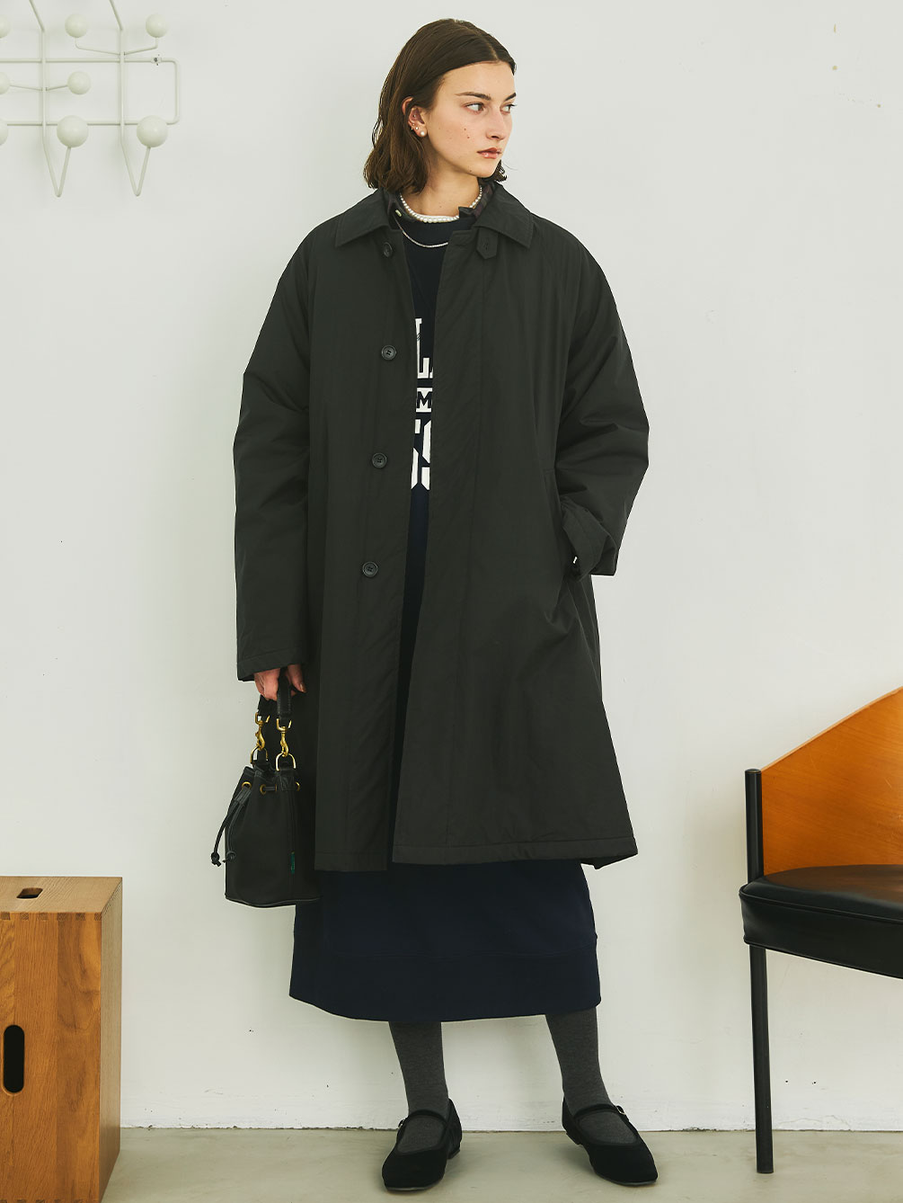 - 羽のように軽いステンカラーの中綿コート