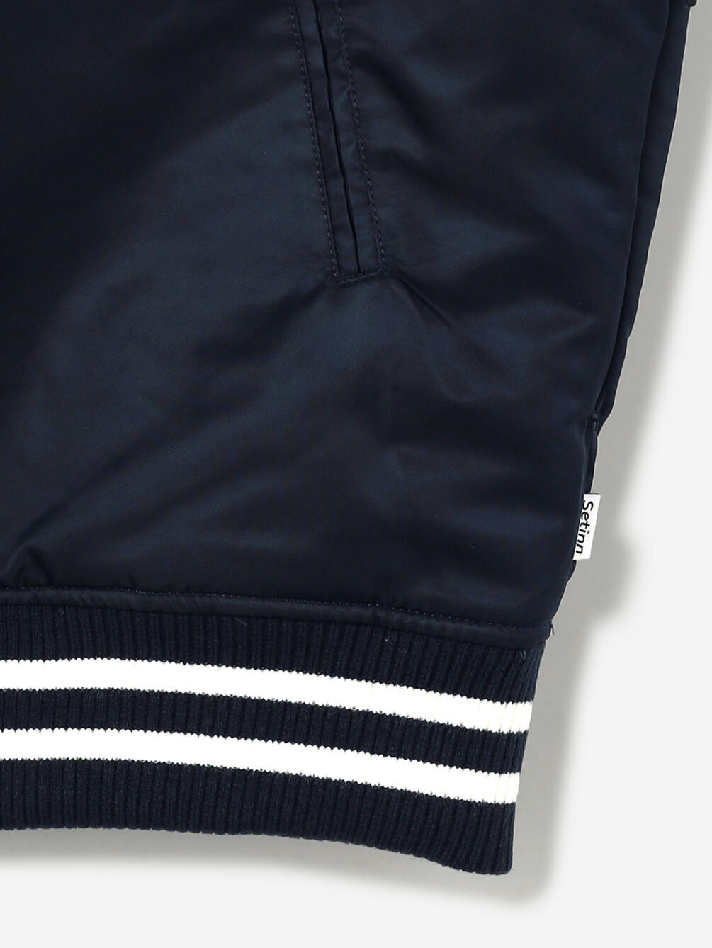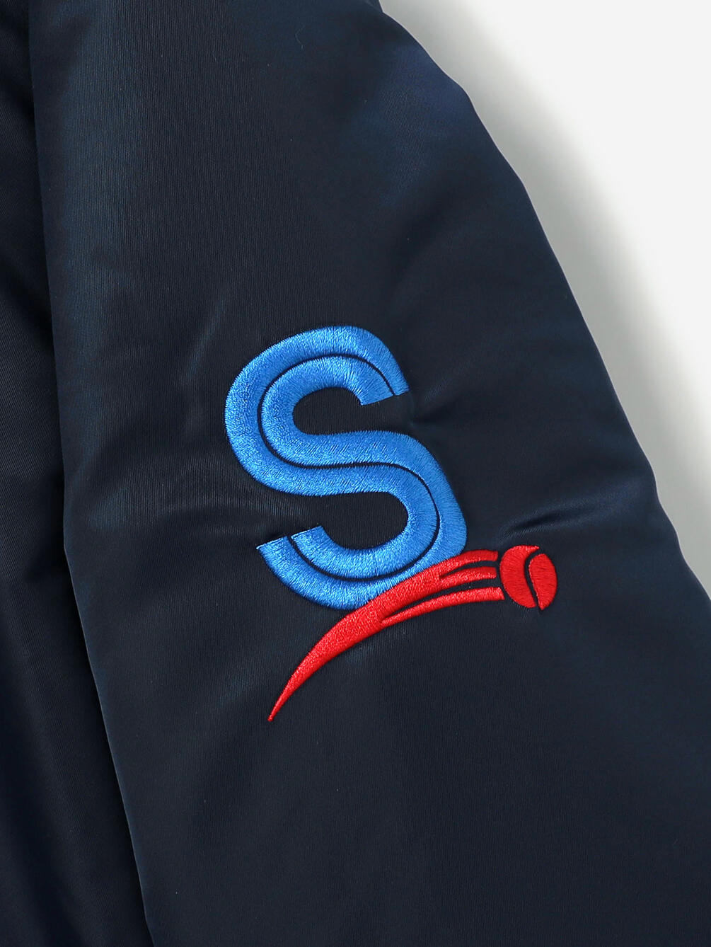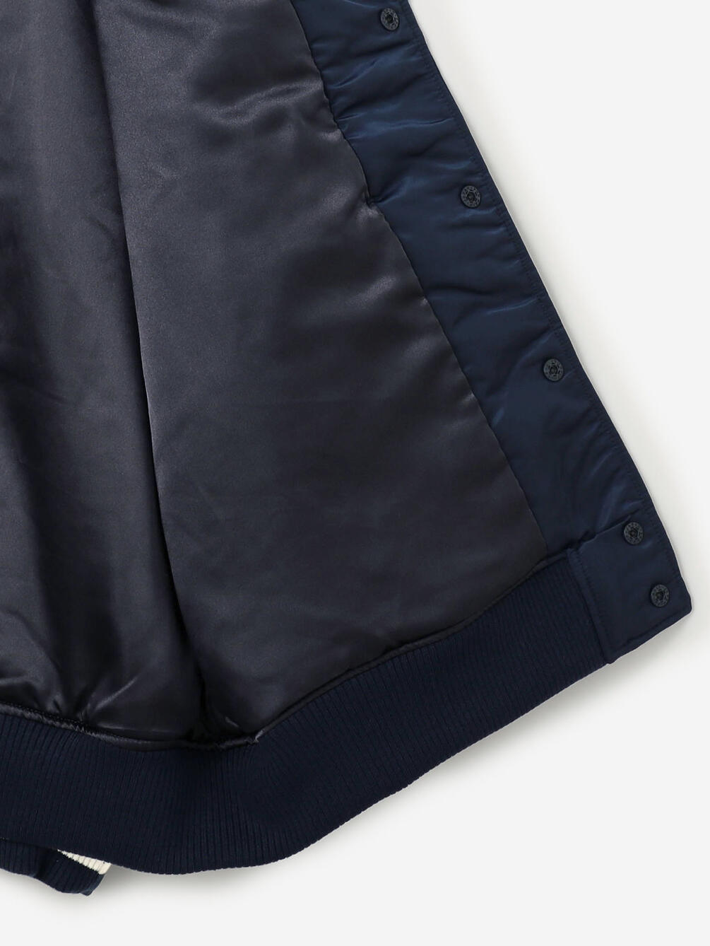 素材 | 表地:ナイロン100% 裏地:ポリエステル100% 中わた:ポリエステル100% 刺繍部分:ポリエステル100% 別布:コットン100% リブ部分:アクリル85% ポリエステル13% ポリウレタン2% |