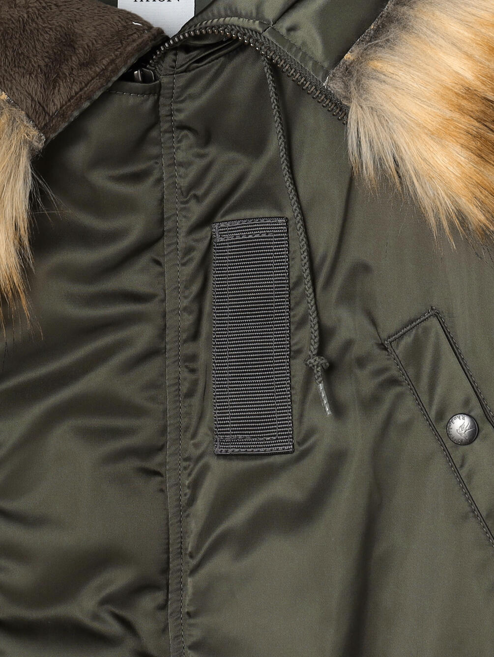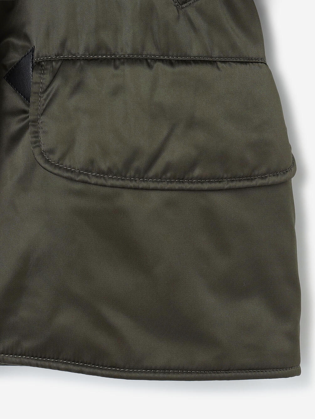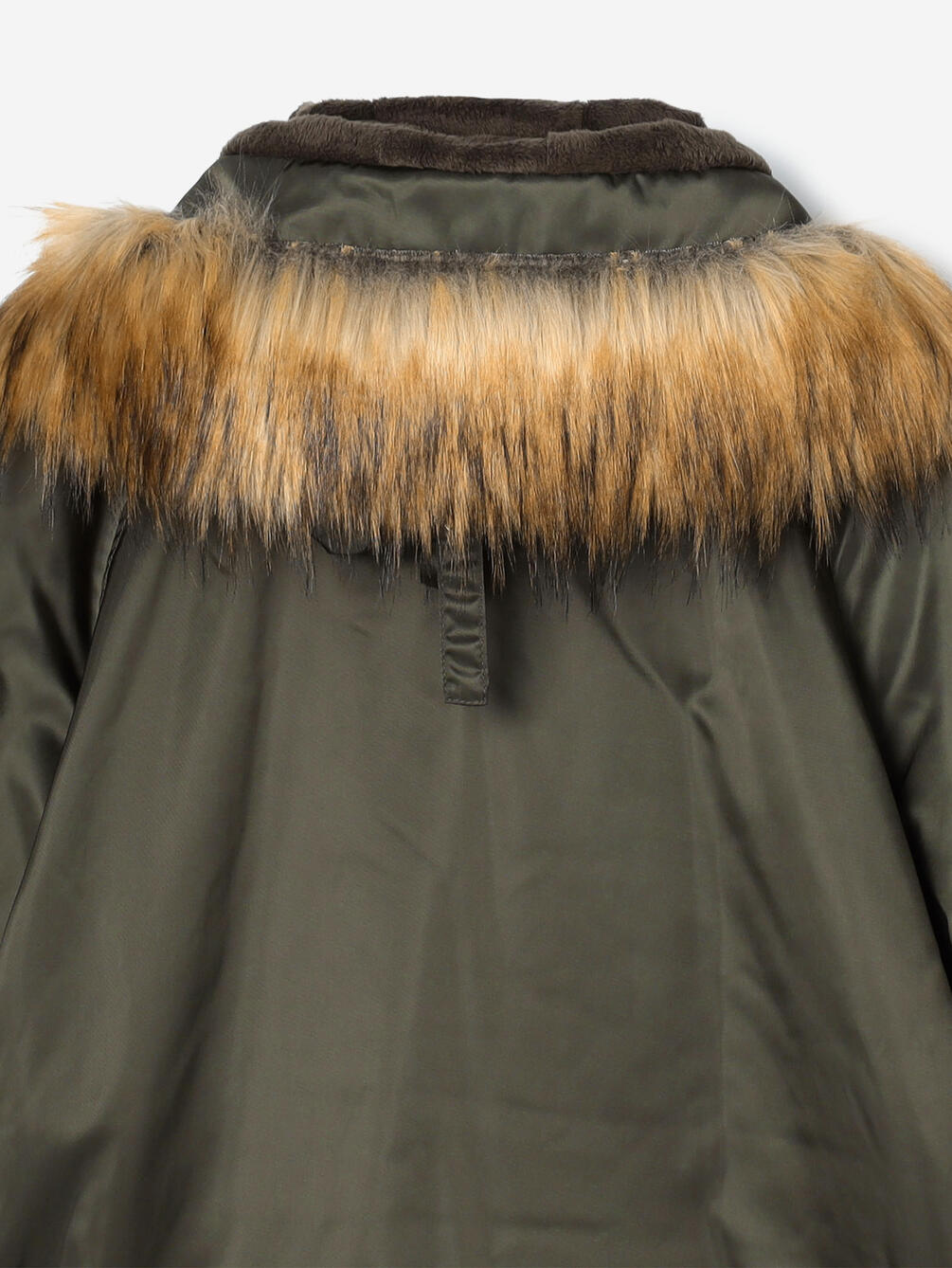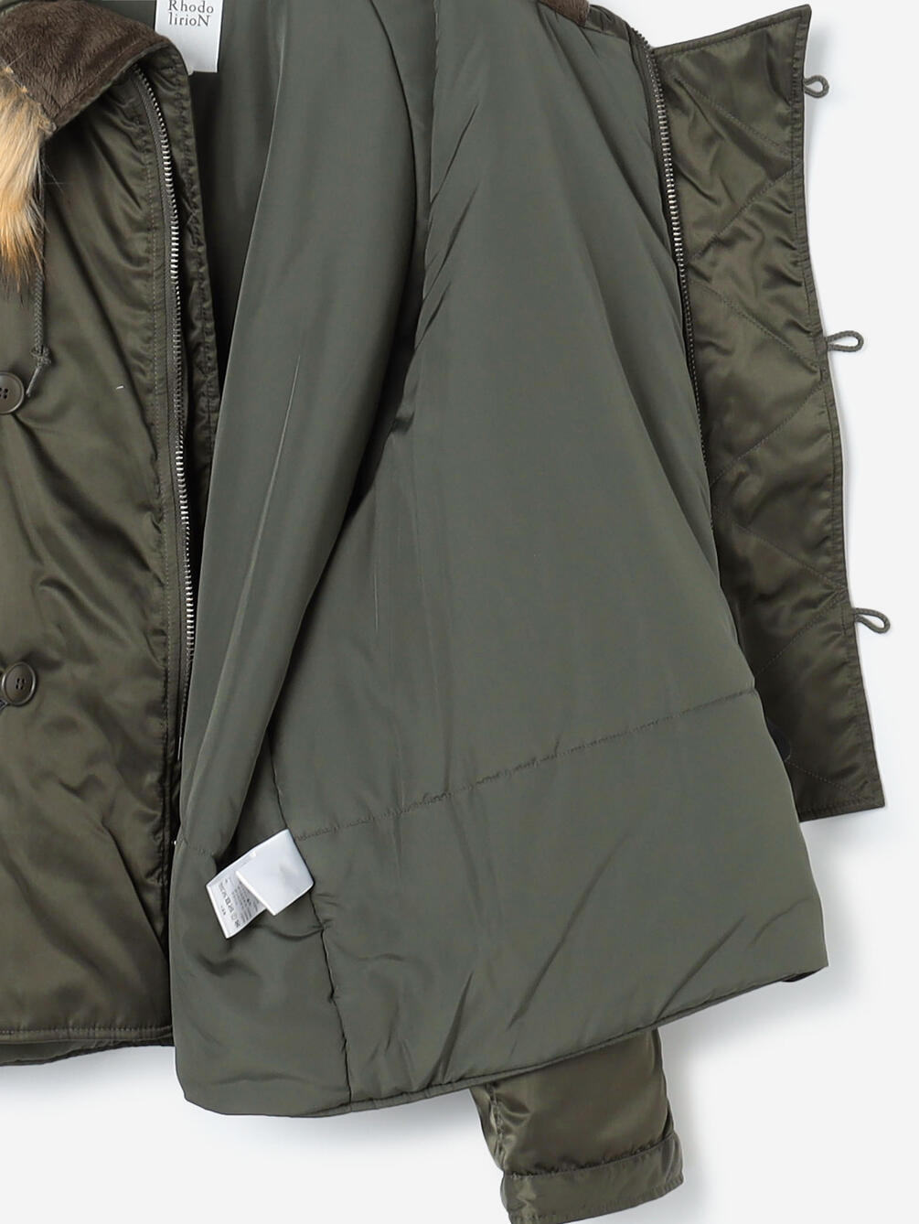 | 素材 | 表地:ナイロン100% 裏地:ポリエステル100% 別布:ポリエステル65% レーヨン35% リブ部分:コットン95% ポリウレタン5% 中わた:ポリエステル100% フード周りファーパイル:アクリル100% フード周りファー基布:ポリエステル100% ファー:ポリエステル100% 紐:アクリル100% |