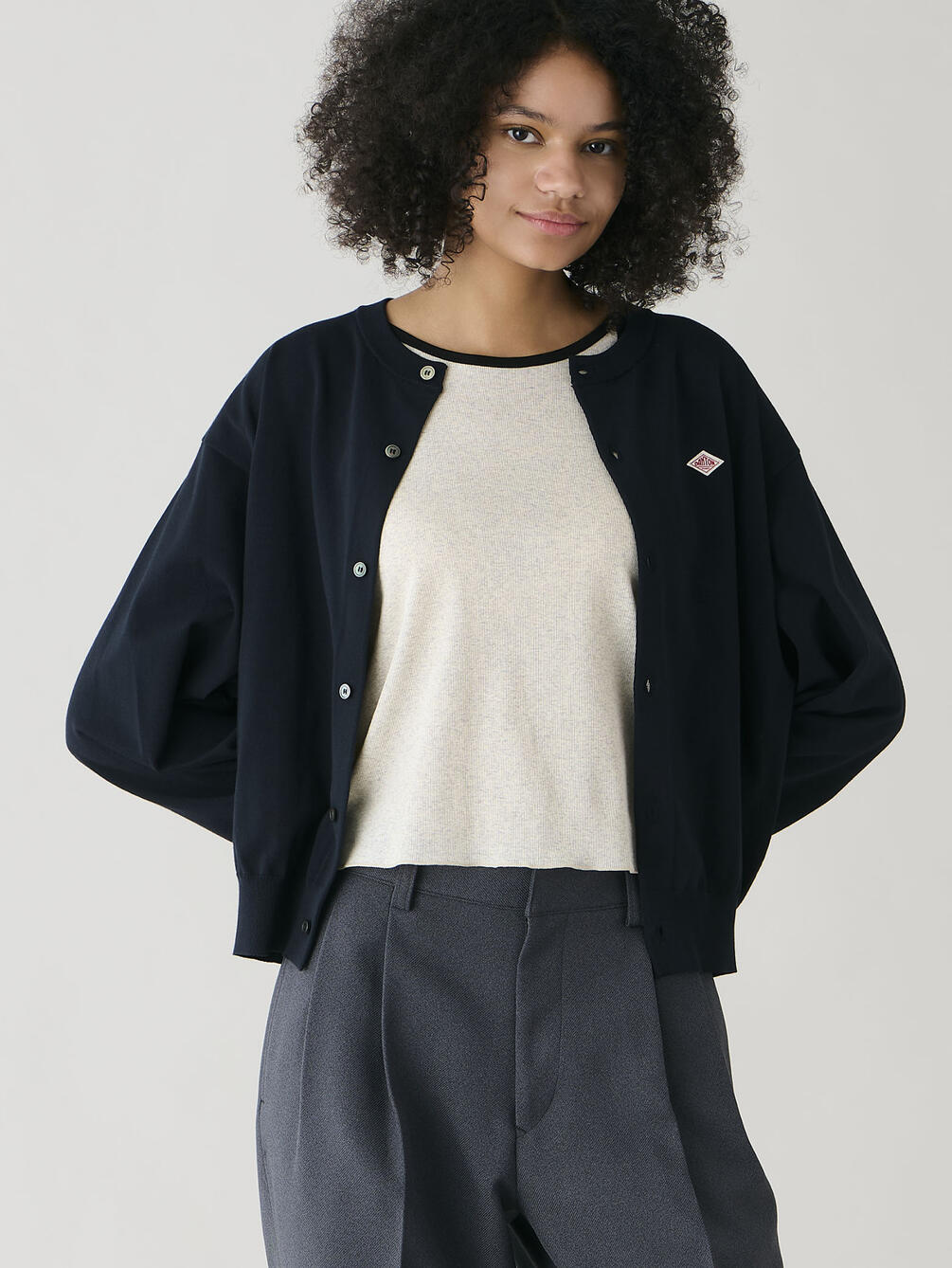 - クルーネックの長袖カーディガン