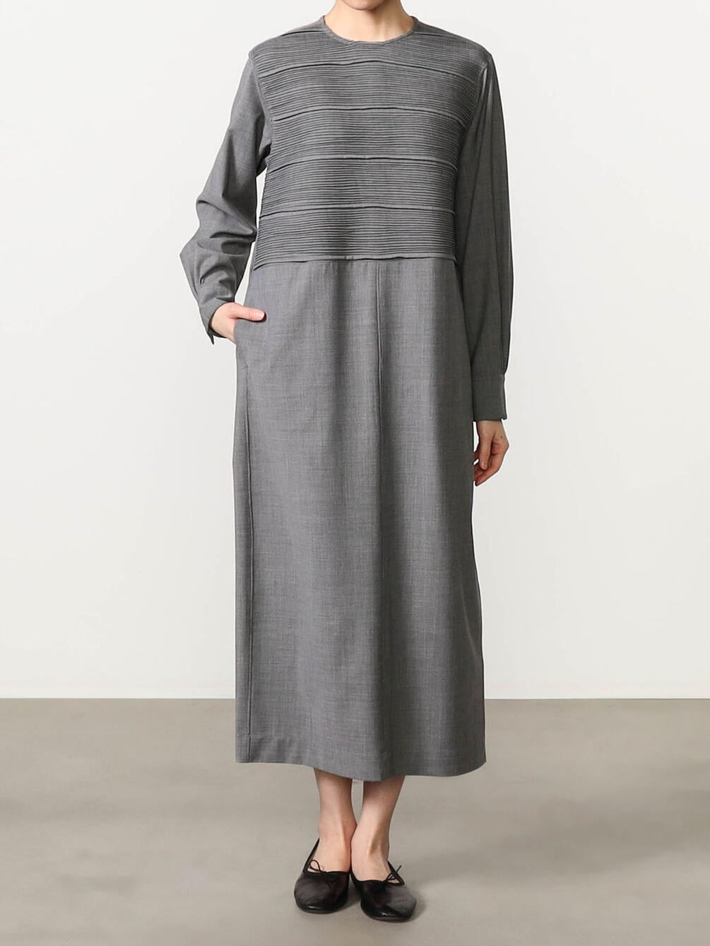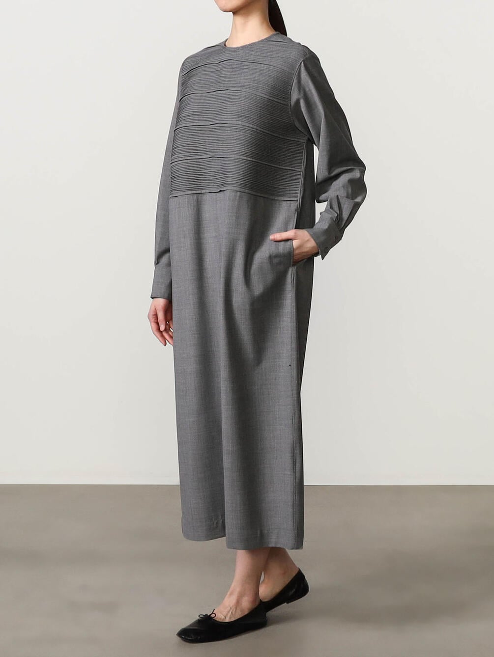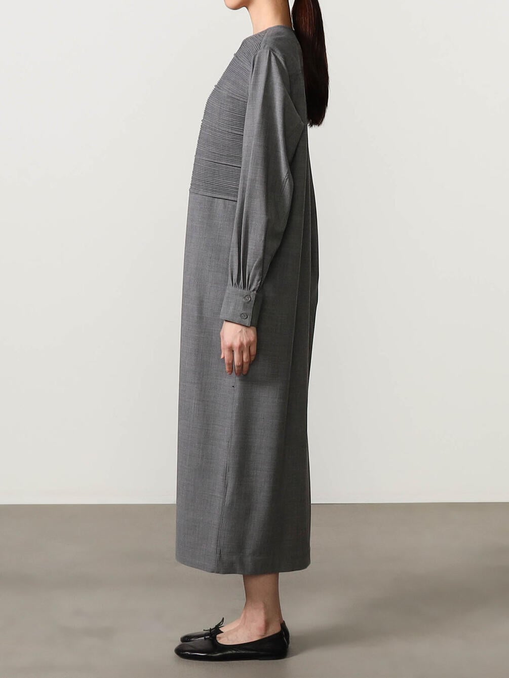 - 胸ヨークに繊細なピンタックを配した長袖ワンピース