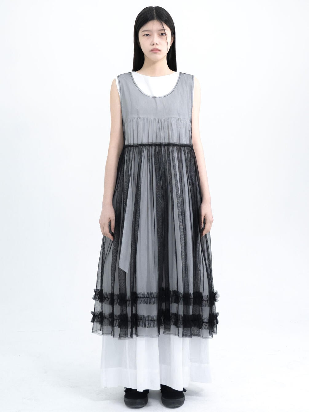 - スリーブレスのティアードワンピース