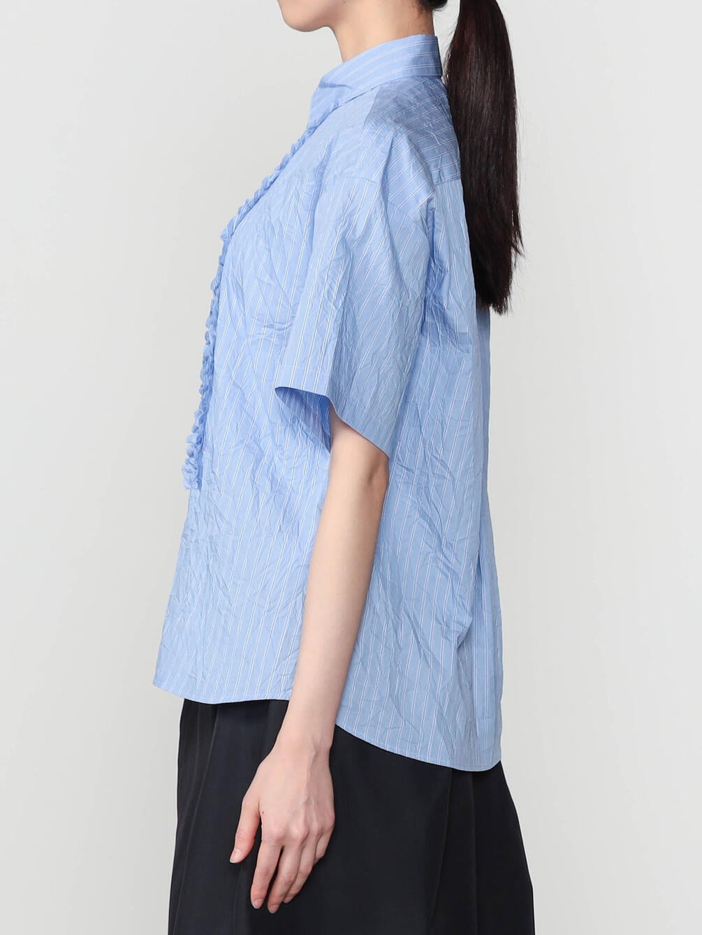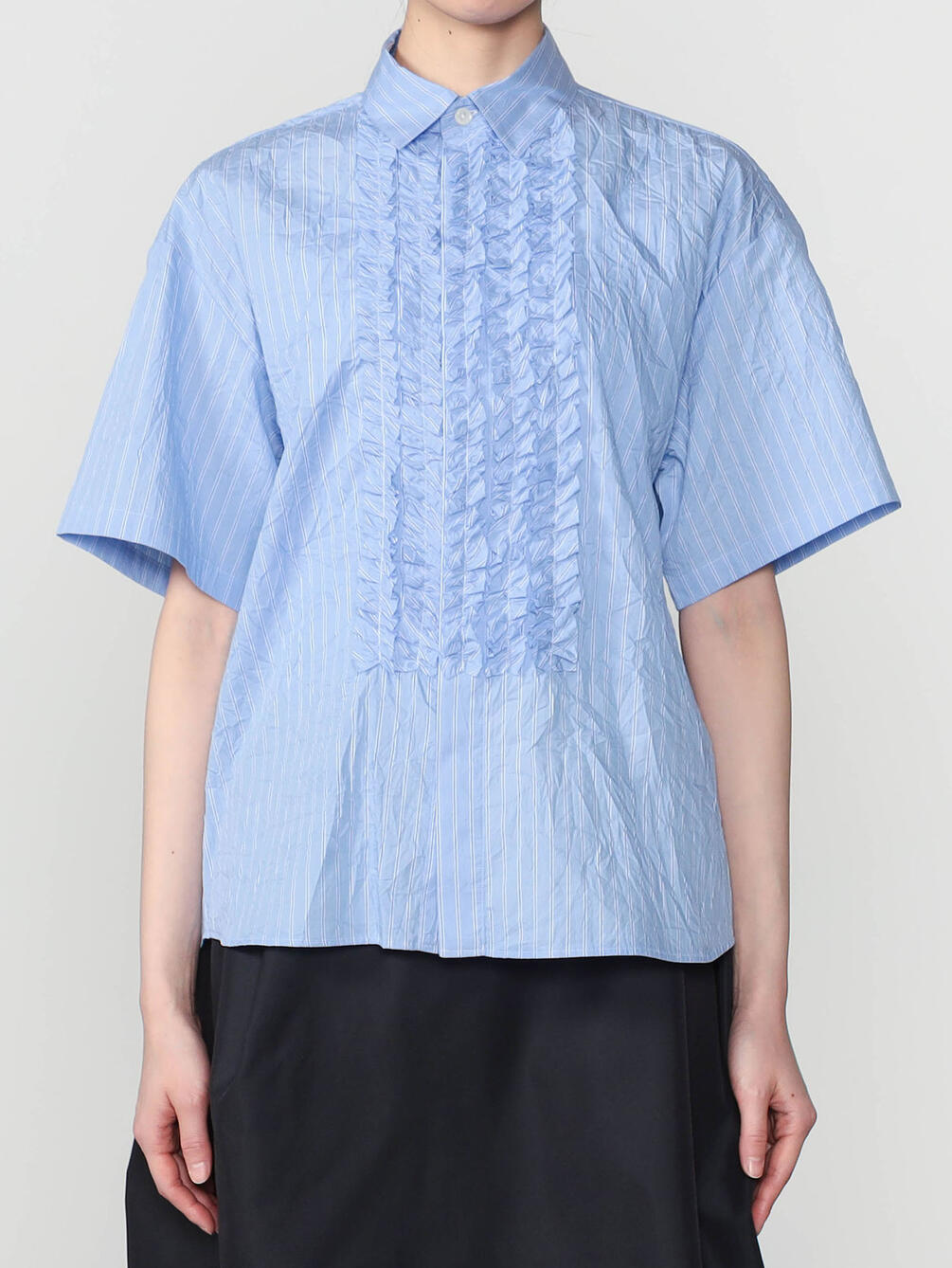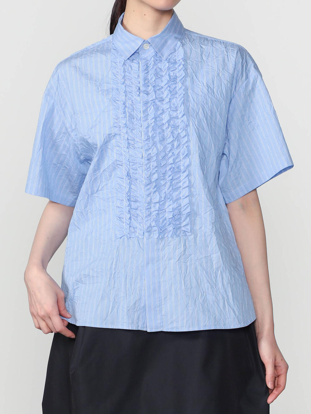 - フロントにフリルをあしらった半袖シャツ