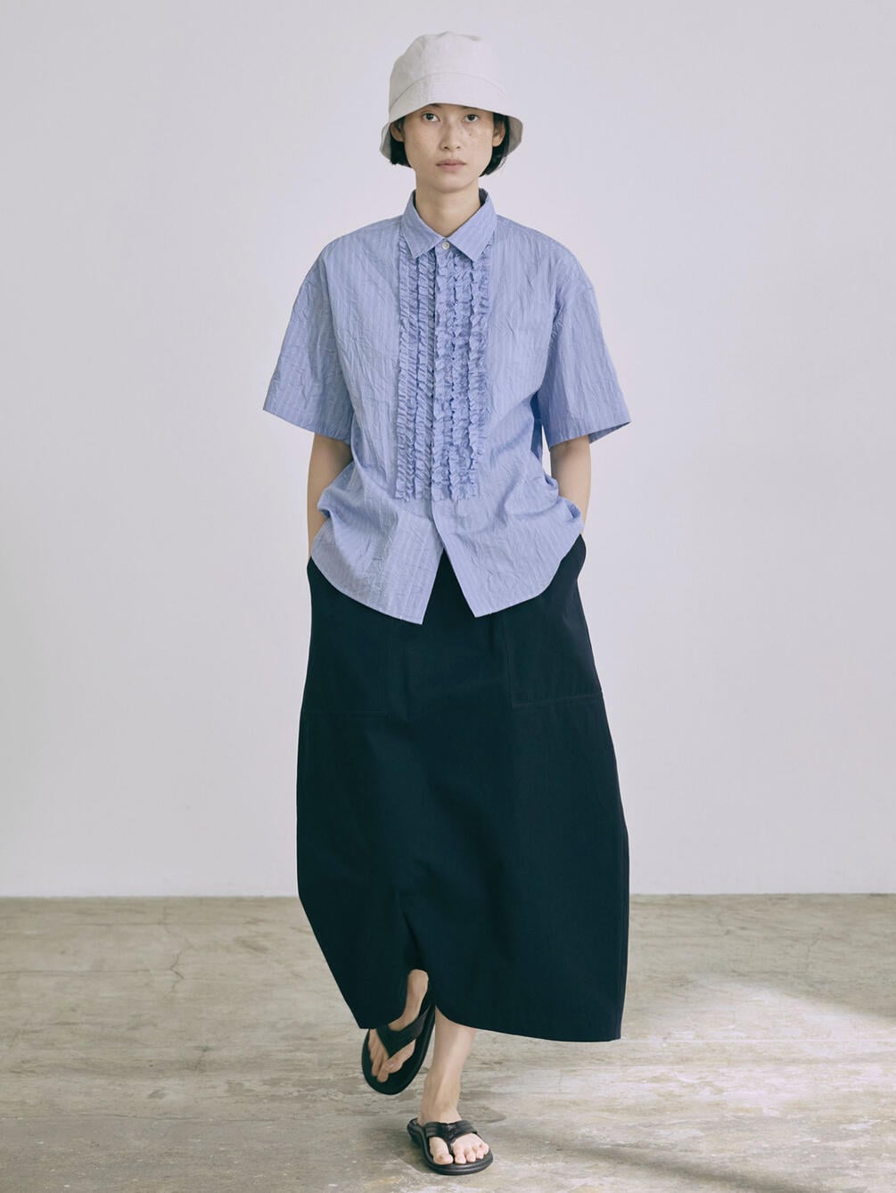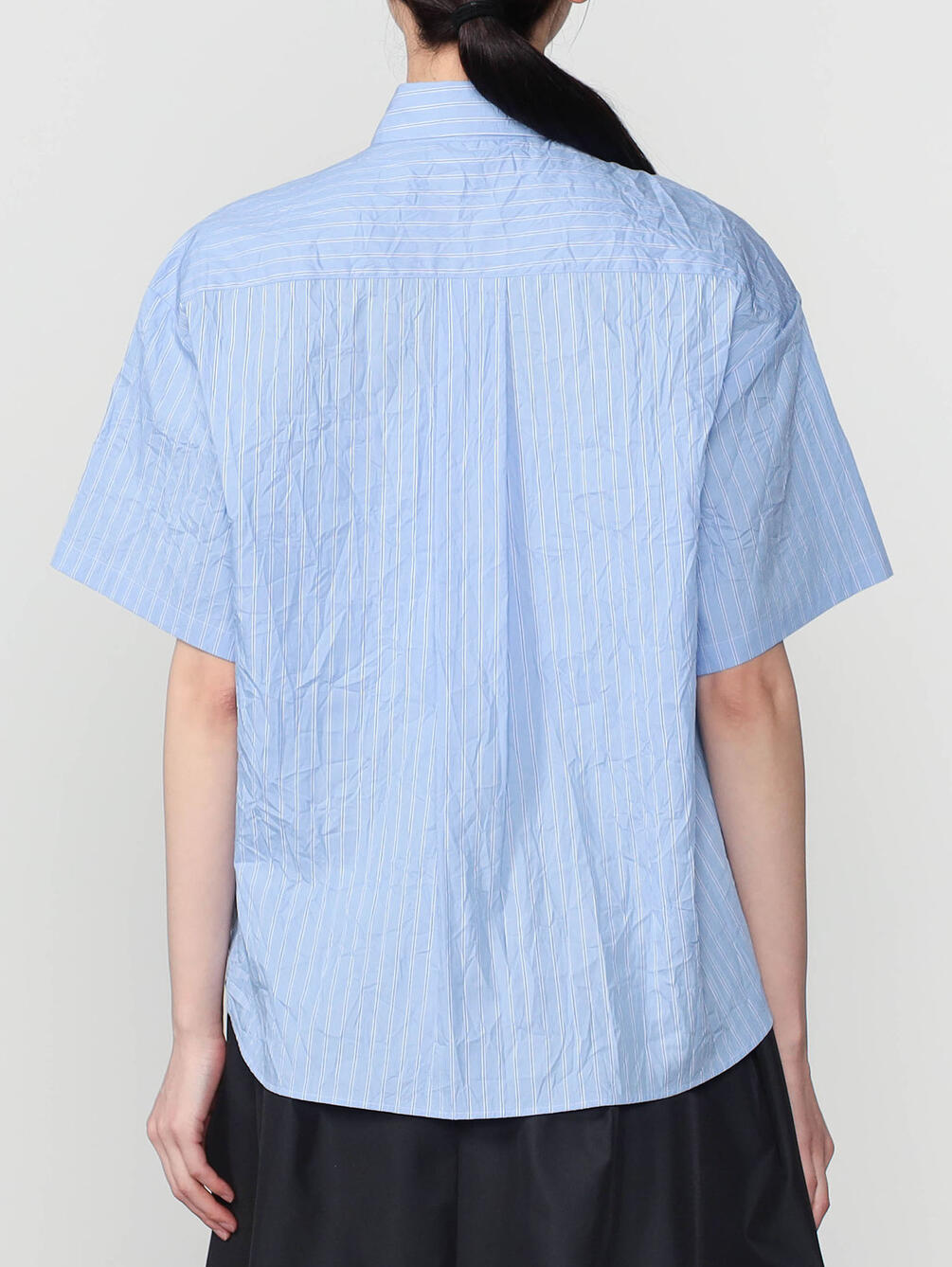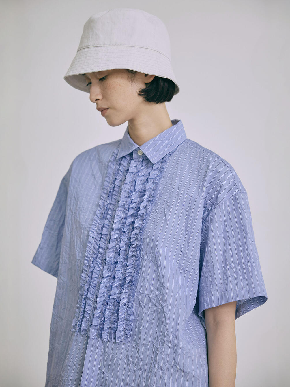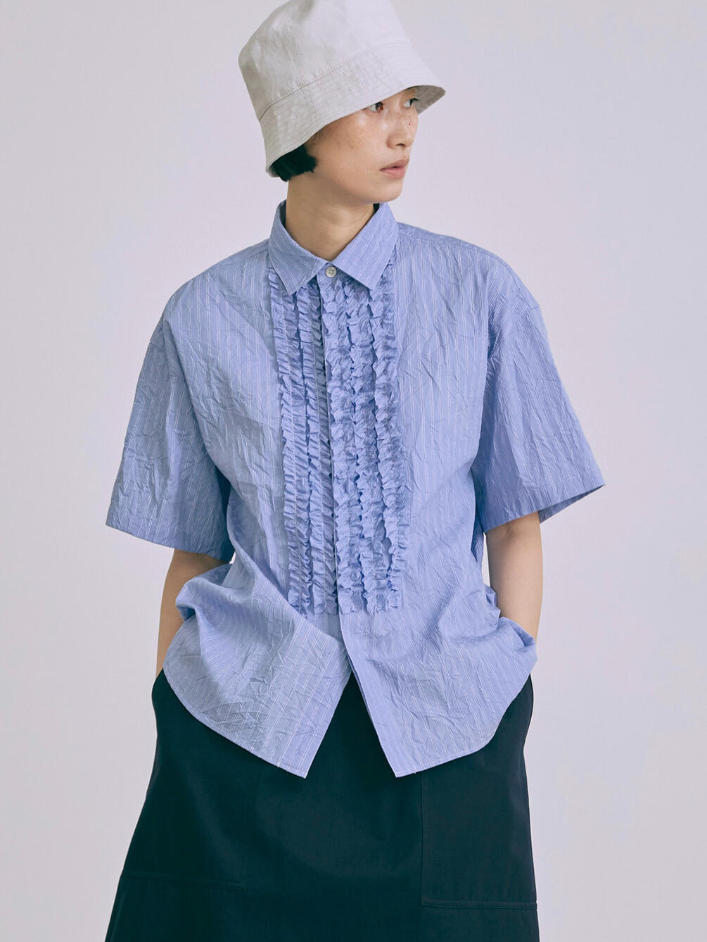 - フロントにフリルをあしらった半袖シャツ
