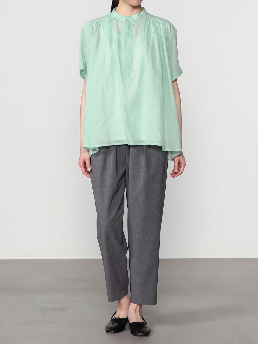 - スタンドカラーの半袖プルオーバーシャツ